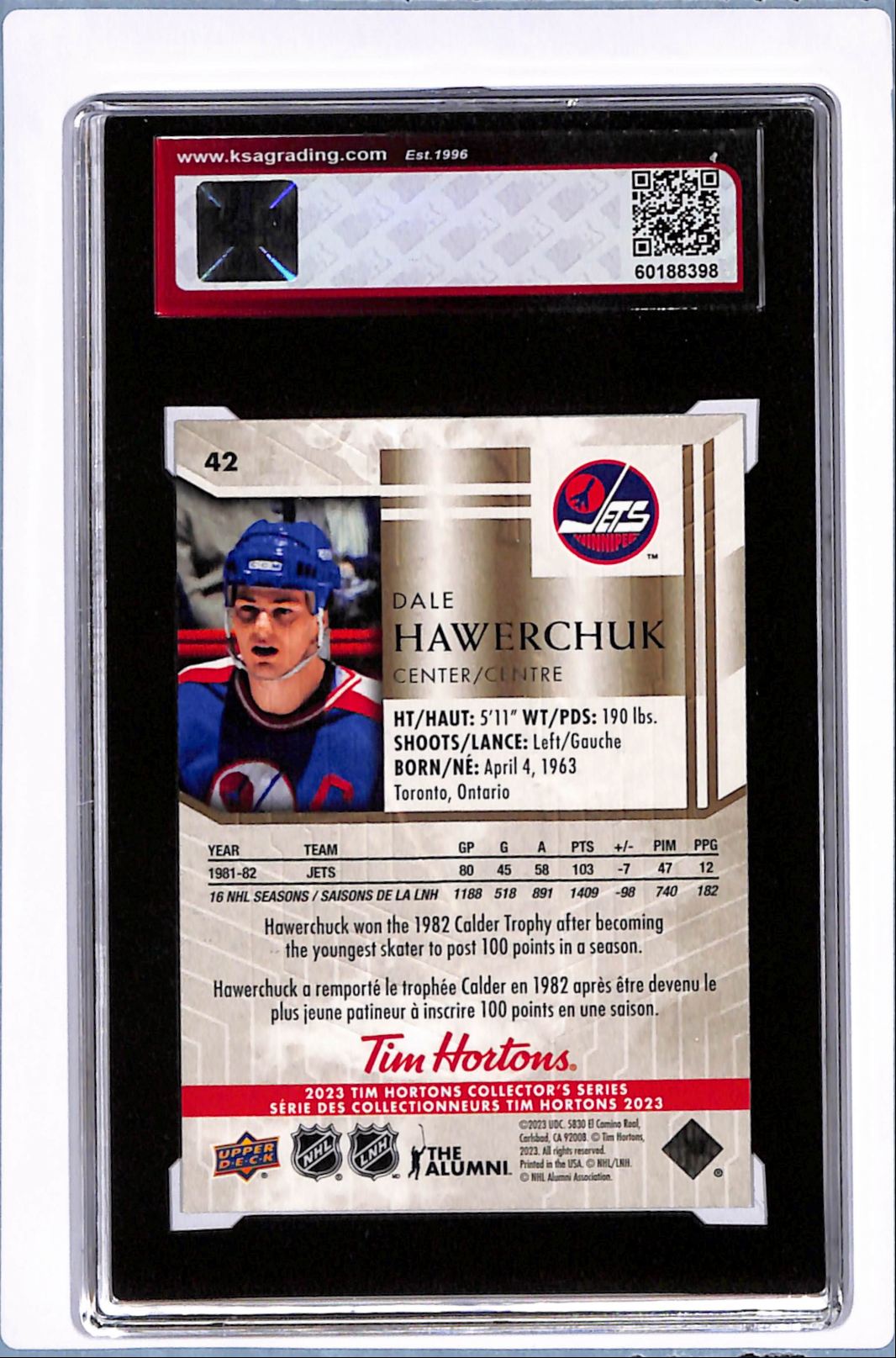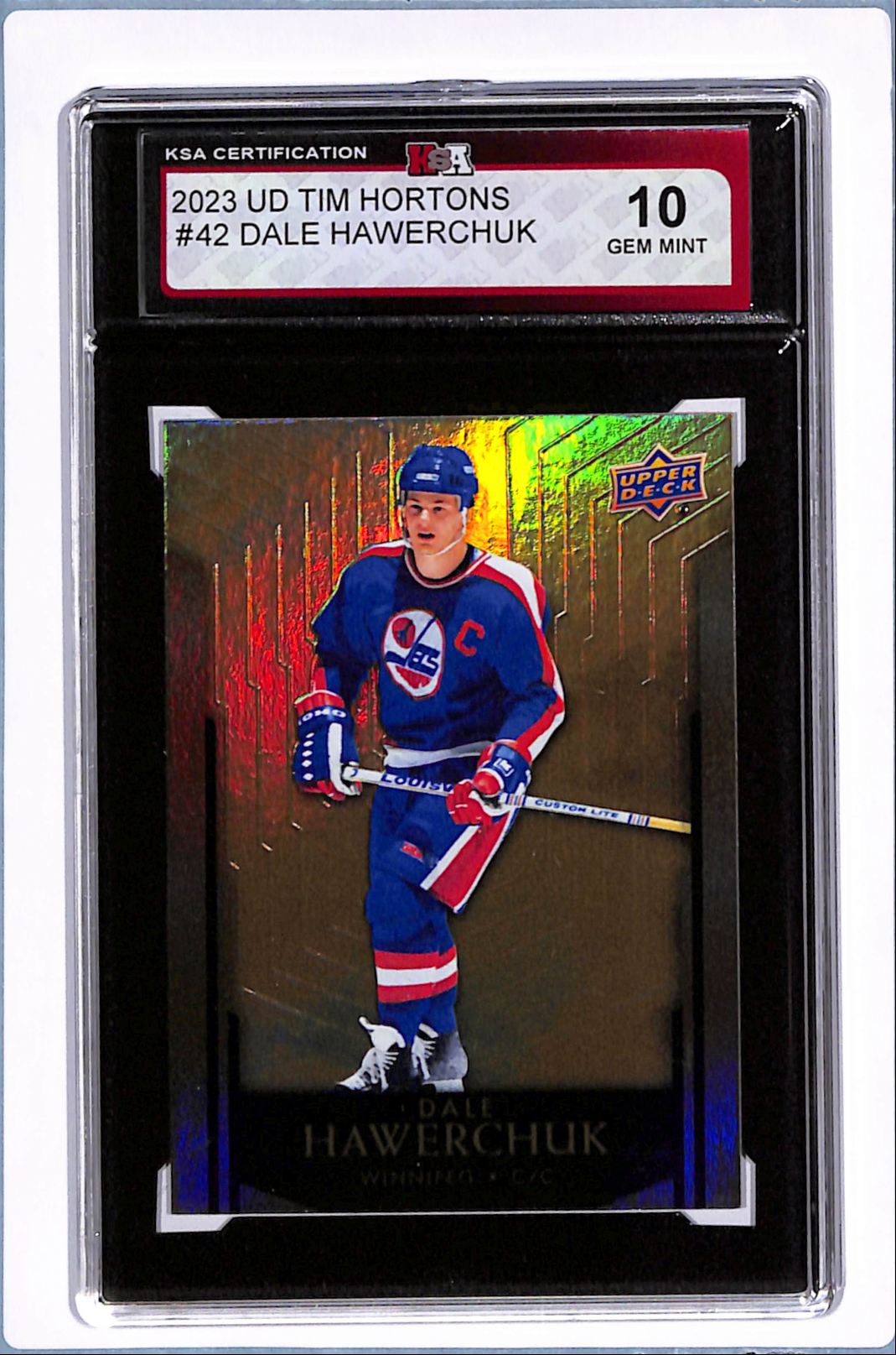 | Description: | Dale Hawerchuk | | Category: | Hockey | | Year: | 2023 | | Product: | UD Tim Hortons | | Team: | (Free Shipping $100+) | | Card Number: | 42 | | Grade: | 10 KSA | | Dimensions: | 5¼" x 3⅛" | | SKU: | PM B0001 R01 E (7) |