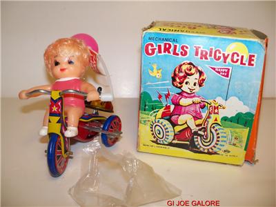 MECHANICAL GIRLS TRICYCLE MINT IN BOX. THE TOY IN NEAR MINT UNPLAYED WITH CONDITION. STILL HAD LITTLE BAGGIE ON HER HEAD. TOY WORKS GREAT UNUSED WITH SUPER DUPER VIBRANT COLOR. TOY MADE IN KOREA ON THE BOX HAS A STICKER THAT SAYS KRON. OHH THE TOY HAS A REVOLVING BELL AND IT'S LOUD WORKS GREAT. THE BOX HAS MINOR STORAGE WARE PURCHASED AT AN AUCTION A FEW MONTHS BACK, GUY OWNED A TOY STORE IN THE 1980'S SO EVERYTHING THAT WAS LEFT OVER WAS STORED IN BOXES APON BOXES IN HIS STORAGE CONTAINER UNIT. MAN THIS WAS THE BEST AUCTION EVER WHEN I WENT TO THE AUCTION IT WAS LIKE STEPPING BACK IN TIME THERE WHERE SO MANY TOYS. I BOUGHT SO MUCH THAT IT FILLED MY ENTIRE VEHCILE UP TO THE ROOF........................MORE DETAILS IN THE IMAGE CAPTIONS Contact Me WITH ANY QUESTIONS. I COMBINE SHIPPING COST TO SAVE $$$$$$.