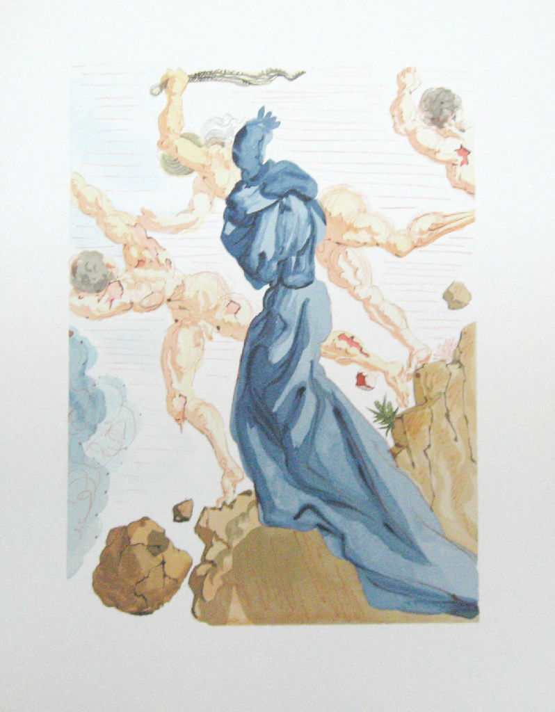Dali illustrated Dante's Divine Comedy with 101 wood engravings.The poem recounts the tale of the poet's journey through Hell and Purgatory guided by Virgil.After repenting his faults, he is joined by Beatrice for the final leg of the journey through Paradise to receive a glimpse of God.Dali often equated Gala, his wife and inspiration, with Dante's Beatrice.Like Dali, Dante's symbolism is complex but highly rational.Both men had a keen knowledge of scientific studies in geology, optics and mathematics.Dali's Divine Comedy will go down in the history of art as a work of the artist's prime years, the early 1950's.