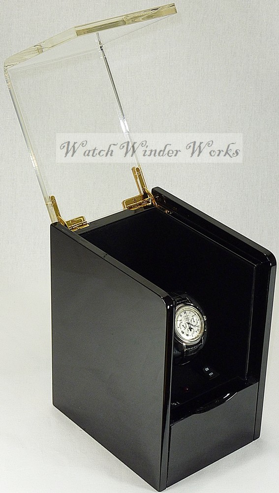 An impressive Luxury Display Automatic Watch Winder for one Chronometer in a Timber Veneer box with a Deep Piano Gloss Ebony Black finish and a Brass Piano Hinged transparent acrylic dust/display lid.
