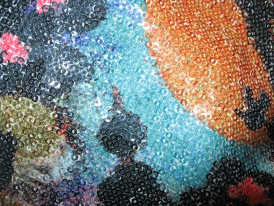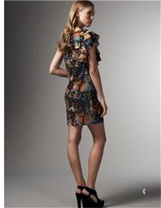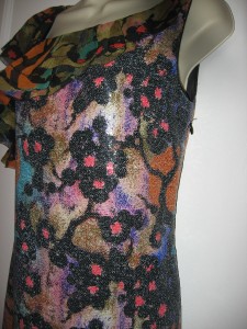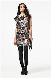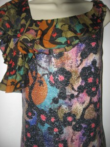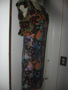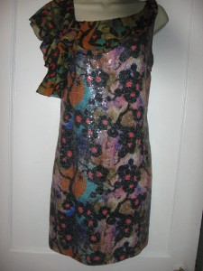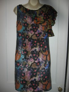Look as beautiful as an abstract painting in this abstract print sequin dress with ruffled asymmetric V neckline, straight skirt and a ruffled back flap for some flirty style. Zips on the side. Fully lined. Dry clean. 33.5" from shoulder.