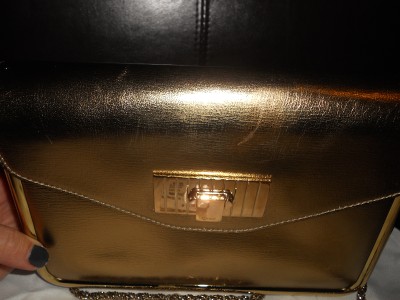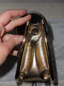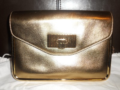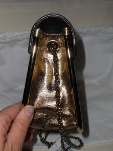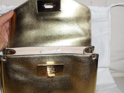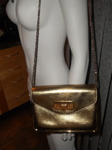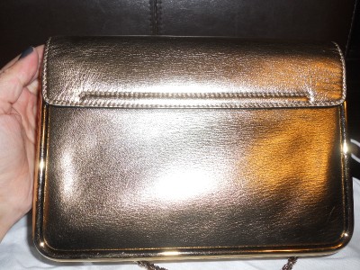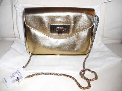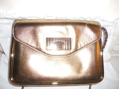Subtle and sparkly, this leather bag is a shimmering accent for day or night.Golden signature hardware. Buckle flap closure. One inside open pocket. Metal feet. Leather lining. 9"W X 6.5"H X 3.5"D. Twisted chain shoulder strap, 16" drop. Made in Italy. Retail price: $1,645.