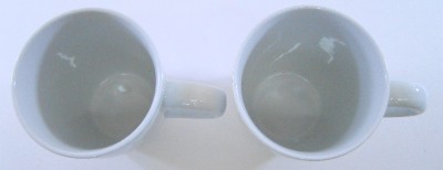 Mugs: 4 1/2"h x 2 1/4"base x 3 1/4"opening diameter