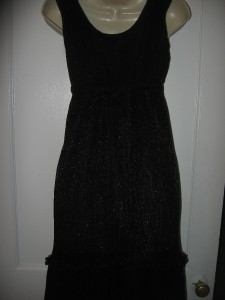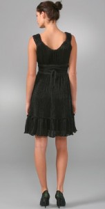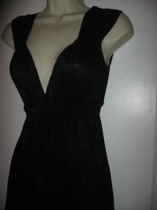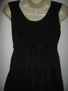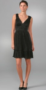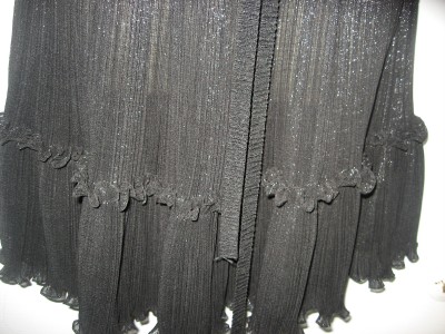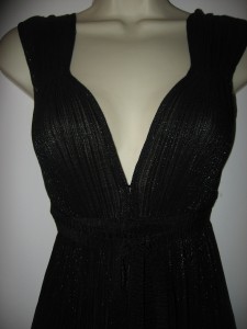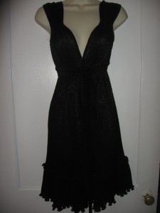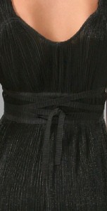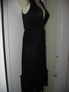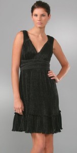 This accordion-pleated chiffon dress features a V neck and metallic shimmer. Gathered elastic banding and attached wraparound tie at waist. Ruffled hem and ruched shoulders. Cap sleeves.