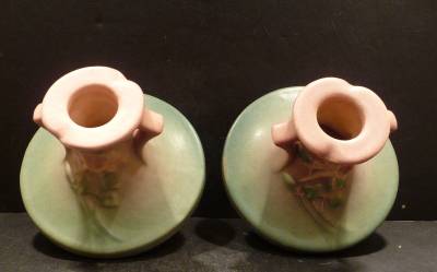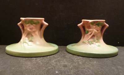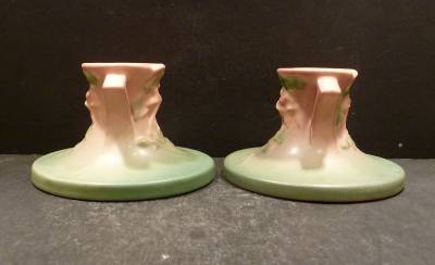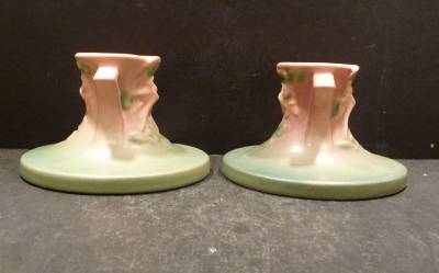 Pink Columbine Candleholders, shape 1145-2 1/2", circa 1941 made by the Roseville Pottery Company are in mint condition, no chips, dings, hairlines, flakes or repairs. Each candleholder is 2 1/2" in height and have a base diameter of 4 1/3" and a rim diameter of 2". They are a nice pair of candleholders. We guarantee our pieces to be as described.