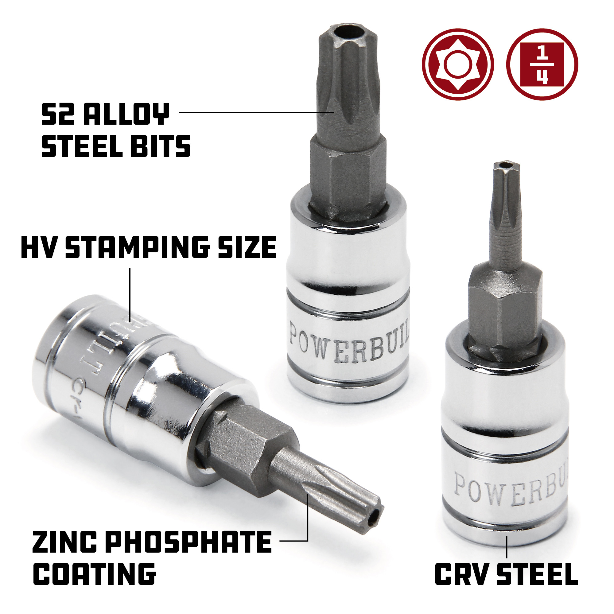 These tough Tamper Proof Star bit sockets are built for the toughest jobs. Powerbuilt 1/4 Inch Drive T-25 Tamper Proof Star Bit Socket features a 2-piece press-fit design for strength and durability. Socket bodies are constructed of tough Chrome Vanadium Steel and mated to S-2 industrial-grade steel bits which ensure a lifetime of reliable use. The hardened S2 steel bits are precision ground for a tight fit onto Tamper-proof Torx Star fasteners. The bit’s Zinc Phosphate coating allows for a protective non-slip function preventing bolts from striping. High visibility sizing is stamped into the mirror-polished Chrome Vanadium sockets.