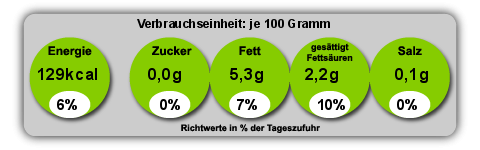 Die Nährwerte beziehen sich auf das angebotene Grundprodukt. Durch die meist handwerkliche Herstellung können sich Abweichungen ergeben. Die empfohlenen Mengen orientieren