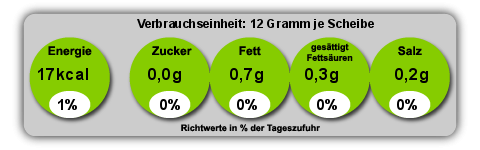 Die Nährwerte beziehen sich auf das angebotene Grundprodukt. Durch die meist handwerkliche Herstellung können sich Abweichungen ergeben. Die empfohlenen Mengen orientieren