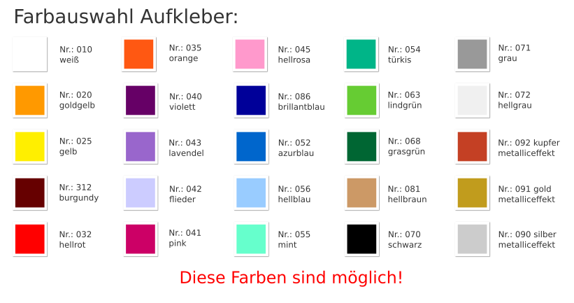 Unsere Aufkleber werden aus hochwertigen Markenfolien hergestellt und sind im Outdoorbereich mindestens 5 bis 7 Jahre haltbar, im Indoorbereich nahezu unbegrenzt.