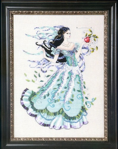 "Dressed to celebrate her birthday in a stunning robin's egg blue gown trimmed with royal purple and embellished with fine ribbons and lace, Biancabella holds the last apple of the season aloft, admiring its succulent scent, wondering if it possesses the power to bring her a true love in spring." Copyright 2013 Mirabilia Designs.