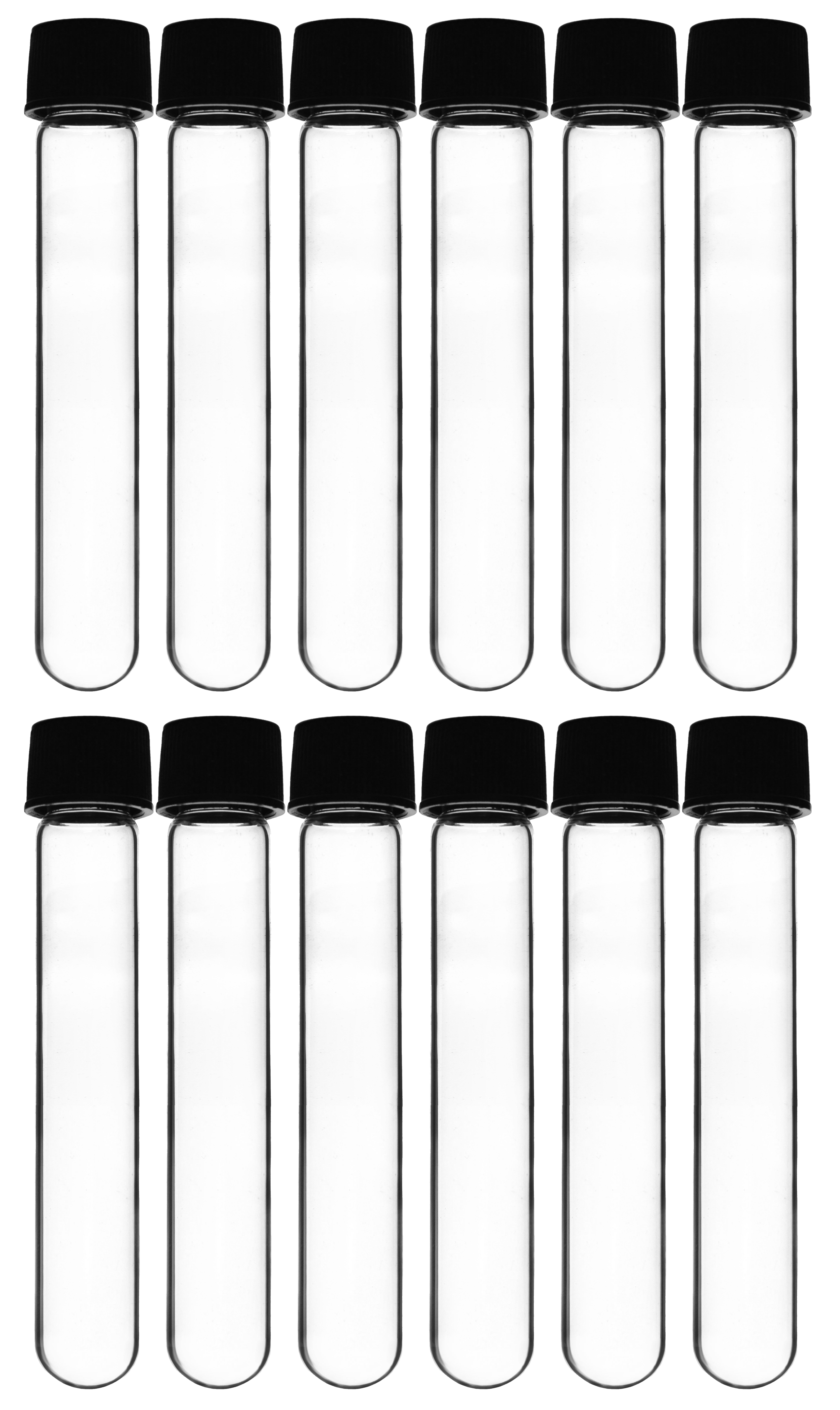 Pack of twelve, round bottom test tubes, each with a 30ml capacity. Tubes are made of high quality Borosilicate 3.3 Glass, and include a Bakelite screw cap with rubber liner for a leak proof seal. Tubes are useful for a variety of laboratory applications including transferring and storing chemicals and samples, and for handling and culturing biological material. Also suitable for use in the home or garage for crafting and storage.