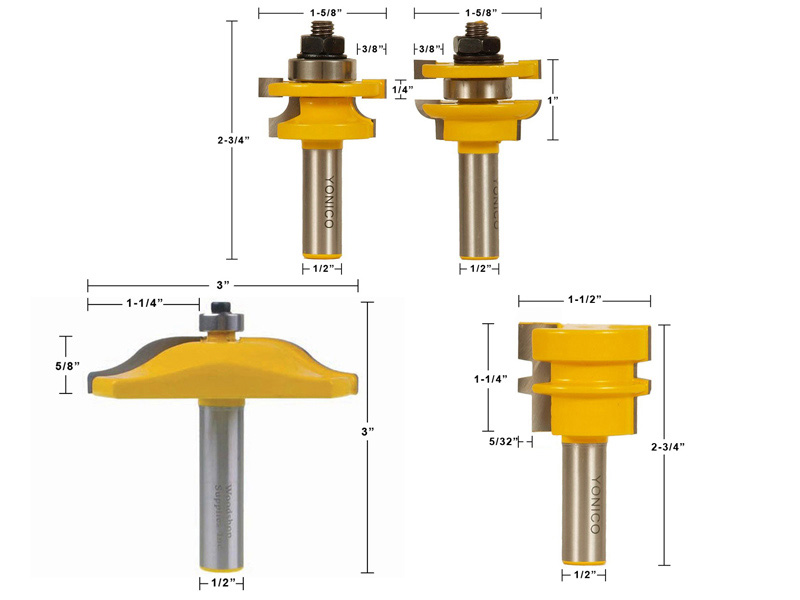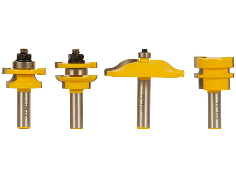 Make professional raised panel cabinet doors with the Yonico 12432 - 4 bit Router bit set. For use with up to 1" stock. Rail and stile bits create a perfect round-over rail & stile door frame. The panel raiser puts a classic ogee edge on the central panel of your door. Use the reversible glue joint bit for gluing up multiple boards to extend panel width. The glue joint bit will rout both joining cuts. Simply set the center of the bit with the center of your stock. Then, run one cut face up and the adjoining cut face down creating a perfect joint. Fully enclosed ball bearing guides allow for precise cuts without the use of a fence. Two flute carbide cutters & 1/2" shanks. Set comes in a solid wood storage case.