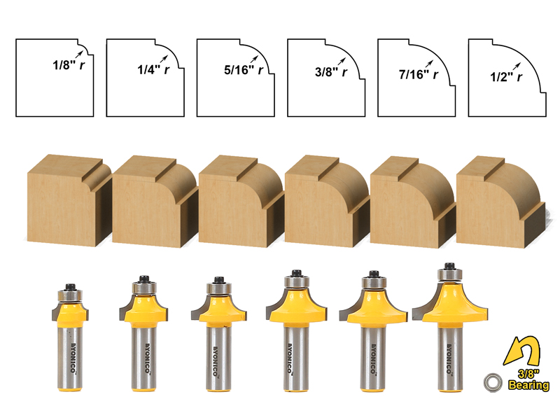 This set includes 6 Router bits with radius sizes of: 1/8", 1/4", 5/16", 3/8", 7/16", 1/2". The shanks are 1/2" in diameter. Additionally you can use the included 3/8" bearing (1) to convert these bits from round over to beading profiles with a 1/16" fillet.