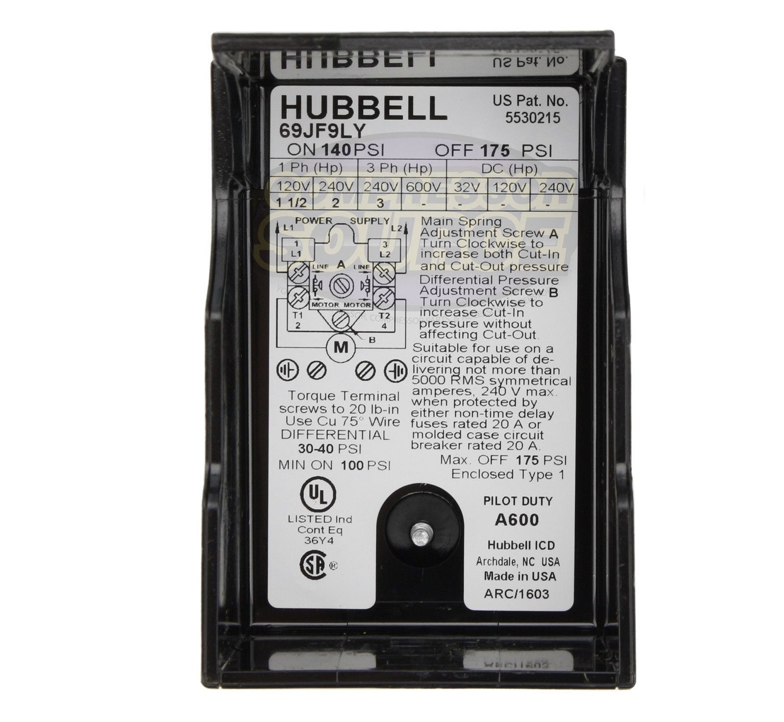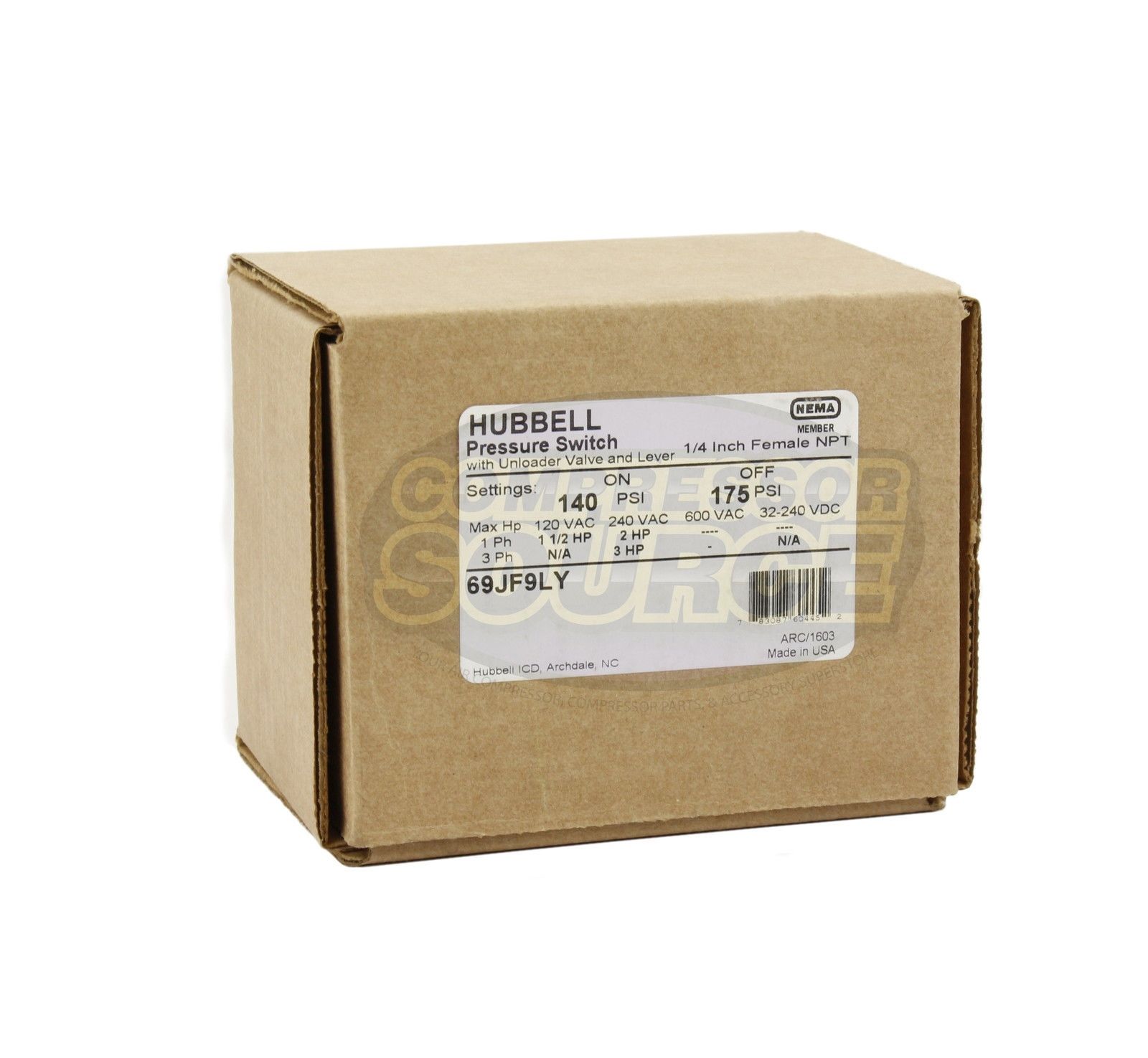Hubbell/Furnas 140-175 PSI air compressor pressure switch control valve with a single 1/4” female NPT air inlet connection port. The switch listed is a universal replacement pressure switch that replaces brands such as Furnas, Square-D, and more. This switch is equipped with an unloader valve, an on/off lever, and a single 1/4” female NPT air inlet port. ( Note: 1/4” NPT measures about 1/2” in diameter.) The unloader equipped on this switch is used to unload the air pressure off the head of the compressor when the compressor shuts off, this way when it starts there is no pressure on the piston and the compressor can start load free. This valve usually has a 1/4" plastic or copper line that runs to the check valve or the head of the compressor. If your compressor does not have an unloader line then this valve can be left not hooked up and the pressure switch will still function properly.