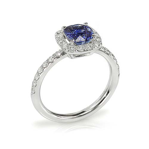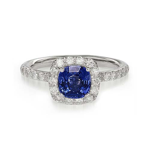 2.85 ct tw Cushion Cut Blue Sapphire Pave Halo Engagement Ring 14K White Gold |