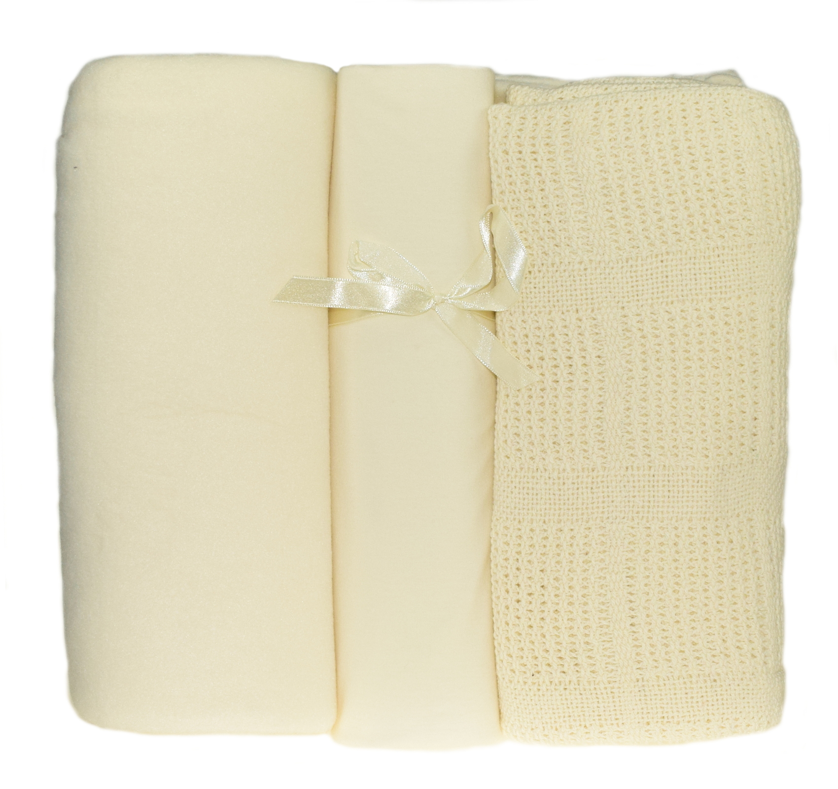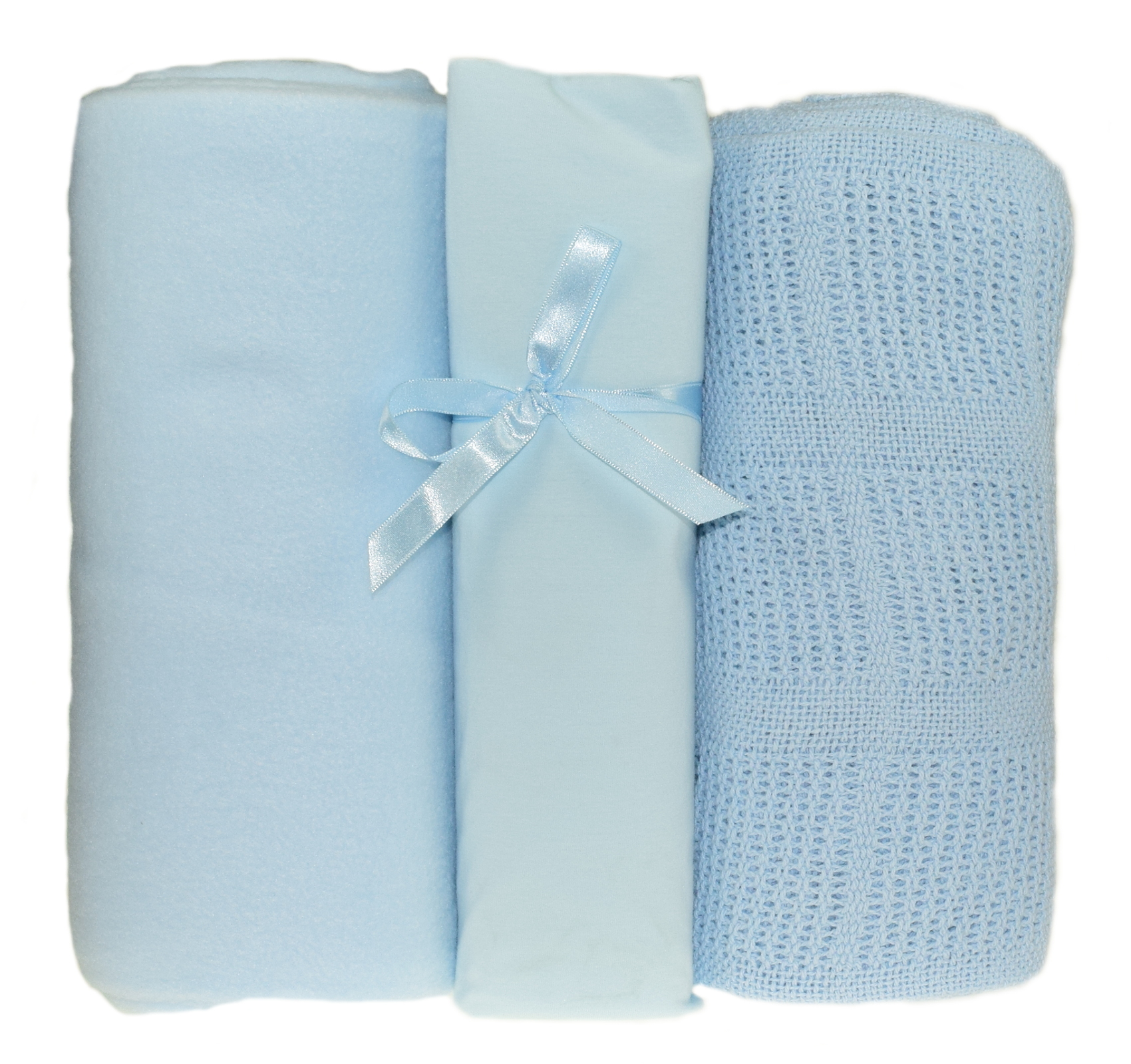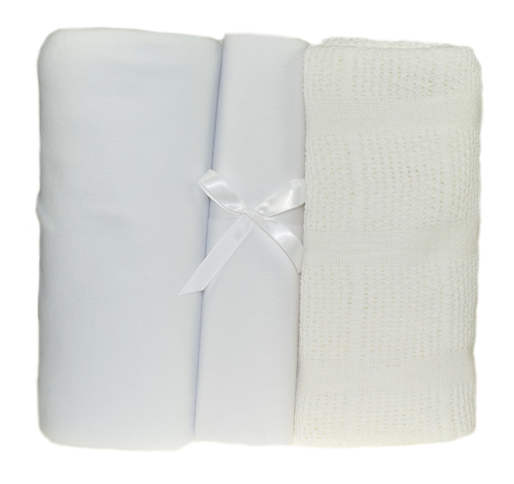 Available in Blue, Cream, Pink and White, each set includes a soft fleece blanket, a soft cotton cellular blanket and a jersey fitted sheet.