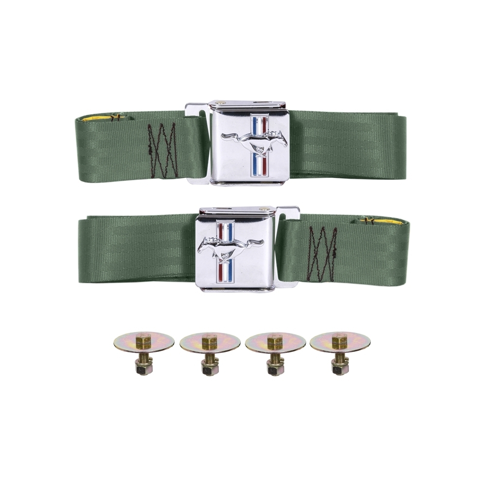 A strong green nylon webbing is used for these lap belts. The buckle is the familiar aircraft style flap and roller accented by the famous running pony on an enameled tri color. Why not upgrade with style? These belts bolt-in in minutes for a clean, classic look. Sold as a pair, fit front or rear.