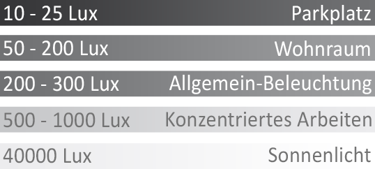 Je weiter man seine Hand vom Licht entfernt, desto weniger Licht fällt darauf. Lux (lx) dient als Kennzahl für die Beleuchtungsstärke und beschreibt, wie viel Licht von der Lichtquelle auf einer gewissen Fläche ankommt. Es dient zur Messung, wieviel Licht tatsächlich auf Ihrem Schreibtisch ankommt.