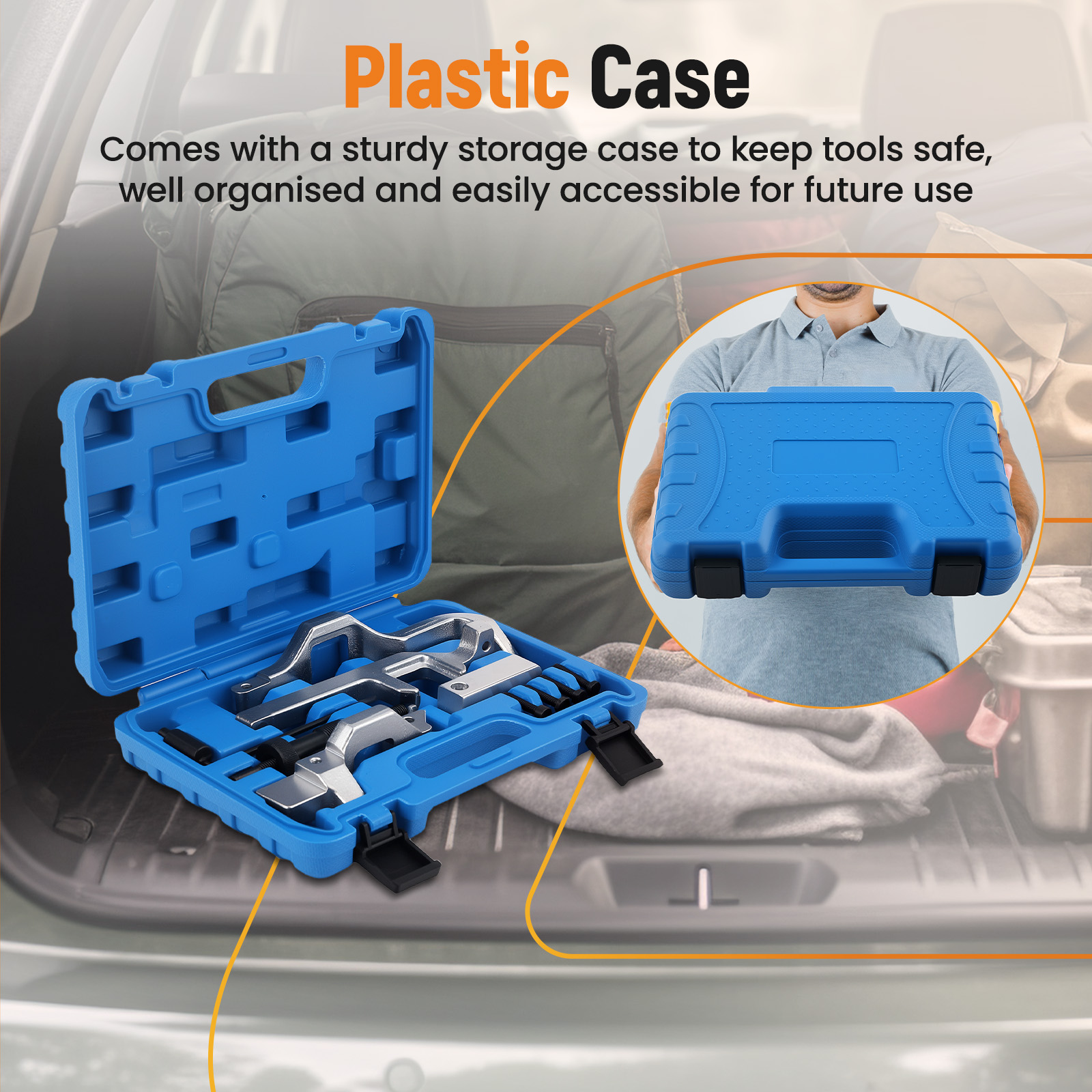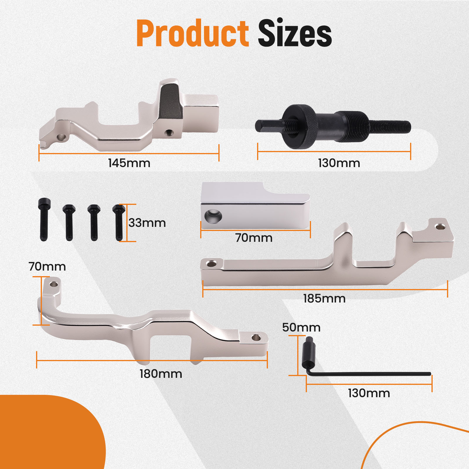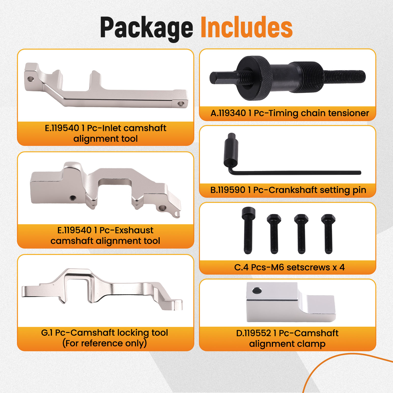 Contains a comprehensive set of timing tools, including locking tool inlet and exhaust, alignment clamp etc. to accommodate various needs.