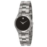 black dial that houses silvertone handsand Movado silvertone signature