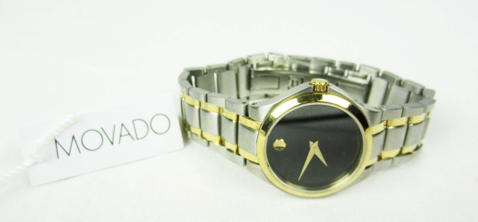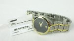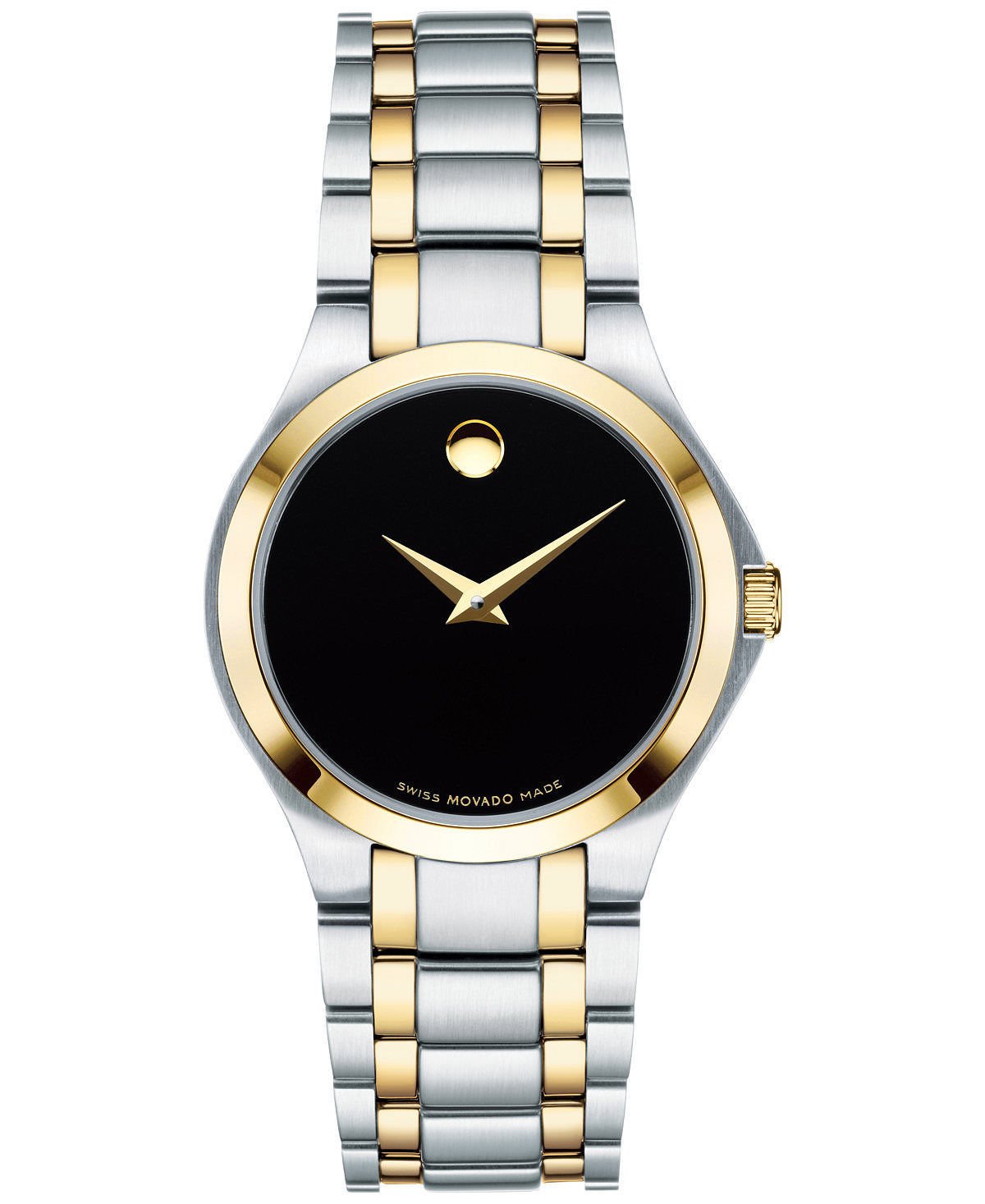 Black dial with gold-tone signature dot at twelve o'clock, two hands and Movado logoPhysical Vapor Deposition (PVD) is a coating process used to promote density and help protect from everyday wear and tearRound case, 28mmSilver-tone and gold-tone PVD stainless steel braceletSwiss quartz movement