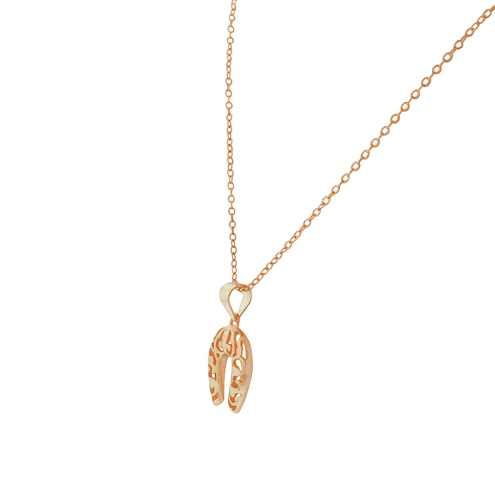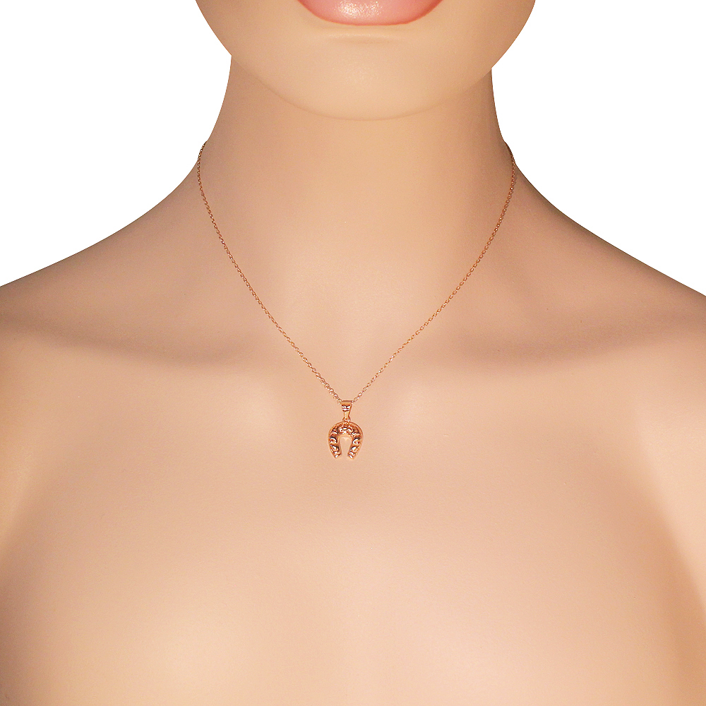 Feature 1: | HORSESHOE DESIGN, unique rose gold tone horseshoe good luck pendant necklace with cutout design |