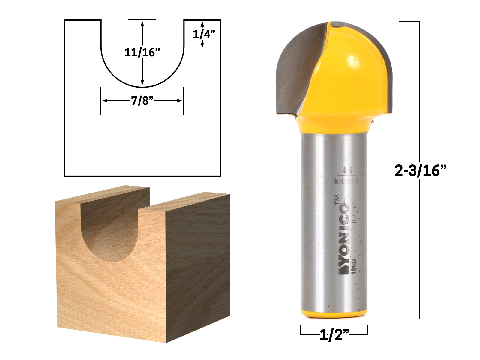 This core box bit features a rounded tip with a 7/16" radius and a 7/8" cutting diameter. The cutting depth is 11/16" and the shank is 1/2".