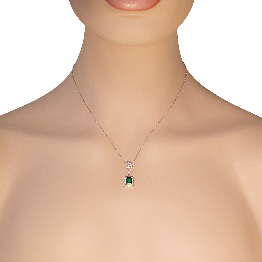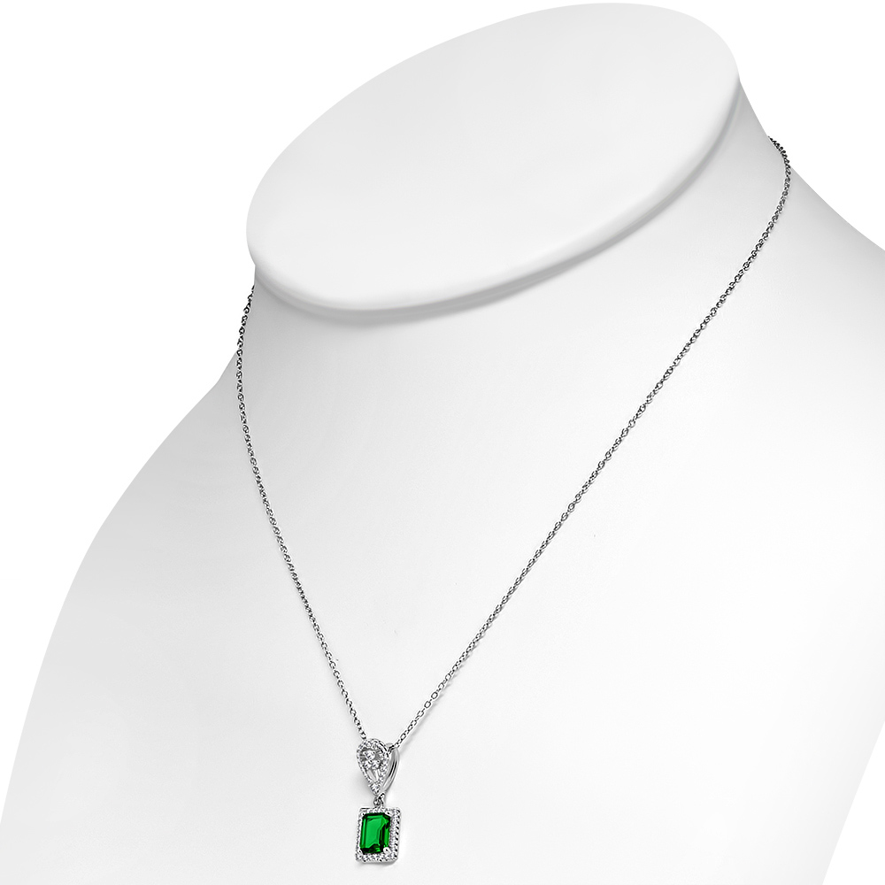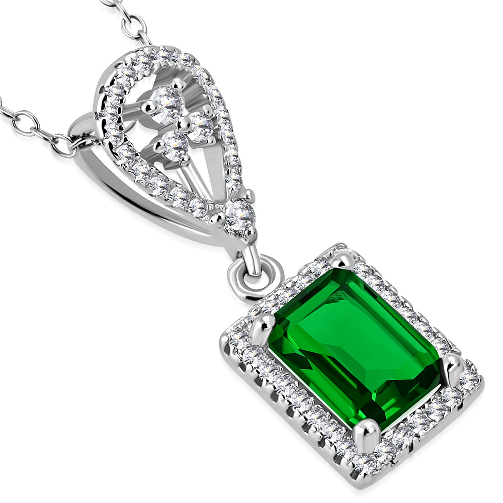 Feature 1: | DETAILED DESIGN, decorated silver tone teardrop rectangular pendant necklace, with green emerald and white clear stone design |