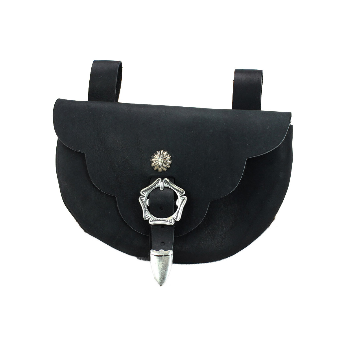Diese robuste Tasche wurde aus ca. 3mm starkem Rindsleder gefertigt.Die Form entspricht einer im gesamten Mittelalter verbreiteten D-Form. Der Taschendeckel erinnert in seiner Stilisierung in Form eines Eichenblattes an die sogenannte Runneburg Tasche, welche auf etwa 1250 datiert ist.