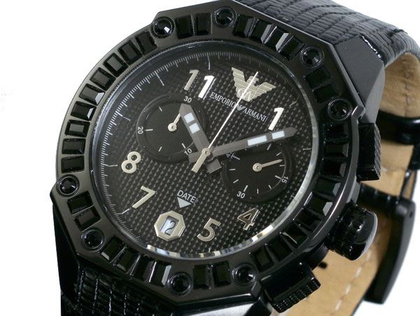 Classy and unique Emporio Armani watch which is round, studded with eye catching stones all around the bezel with silver hour marks, luminous hands, date dial and comfortable genuine leather strap. Watch comes in original box and packaging.