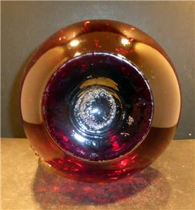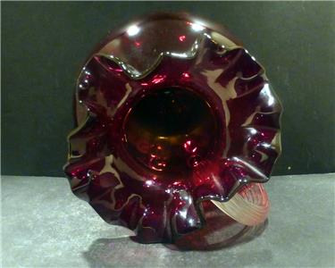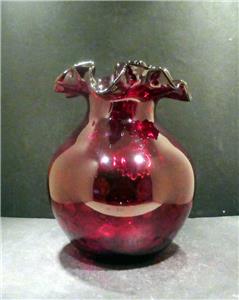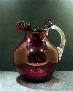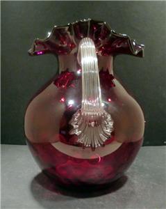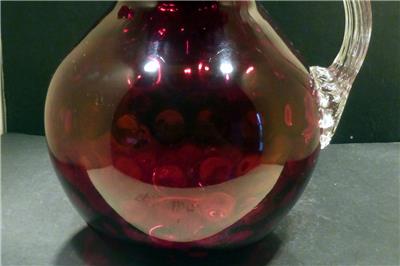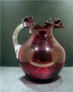 Victorian Red Spot Optic Water Pitcher with a ruffled rim and reeded clear glass handle. It is hand blown with a polished pontil. The Pitcher is MINT with no chips, flakes, hairlines, repairs or scratches. It has a beautiful deep rich red color and when held to the light has a touch of gold (similar to amberina) in the center. It is 8 3/4" in height, 8" in width at its widest point and has a 3 3/4" base diameter and a rim diameter of 6 1/2" at its widest point. It is a gorgeous pitcher that would make a great addition to any collection. We guarantee our pieces to be as described. (Note: The color in pictures appear lighter than the actual color that is a deep red)