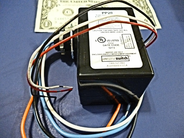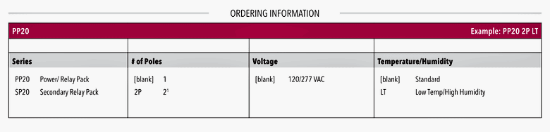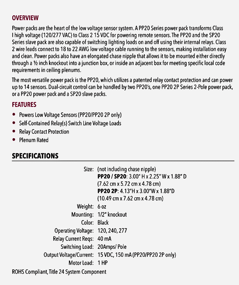 Manufacturer: SensorSwitch Part Number: PP-20 UPC: 745975809592 Voltage: 120/277 vac Frequency: 50/60 hz Low Voltage Output: 150ma, 15 vdc Relay Current: 20 amps |