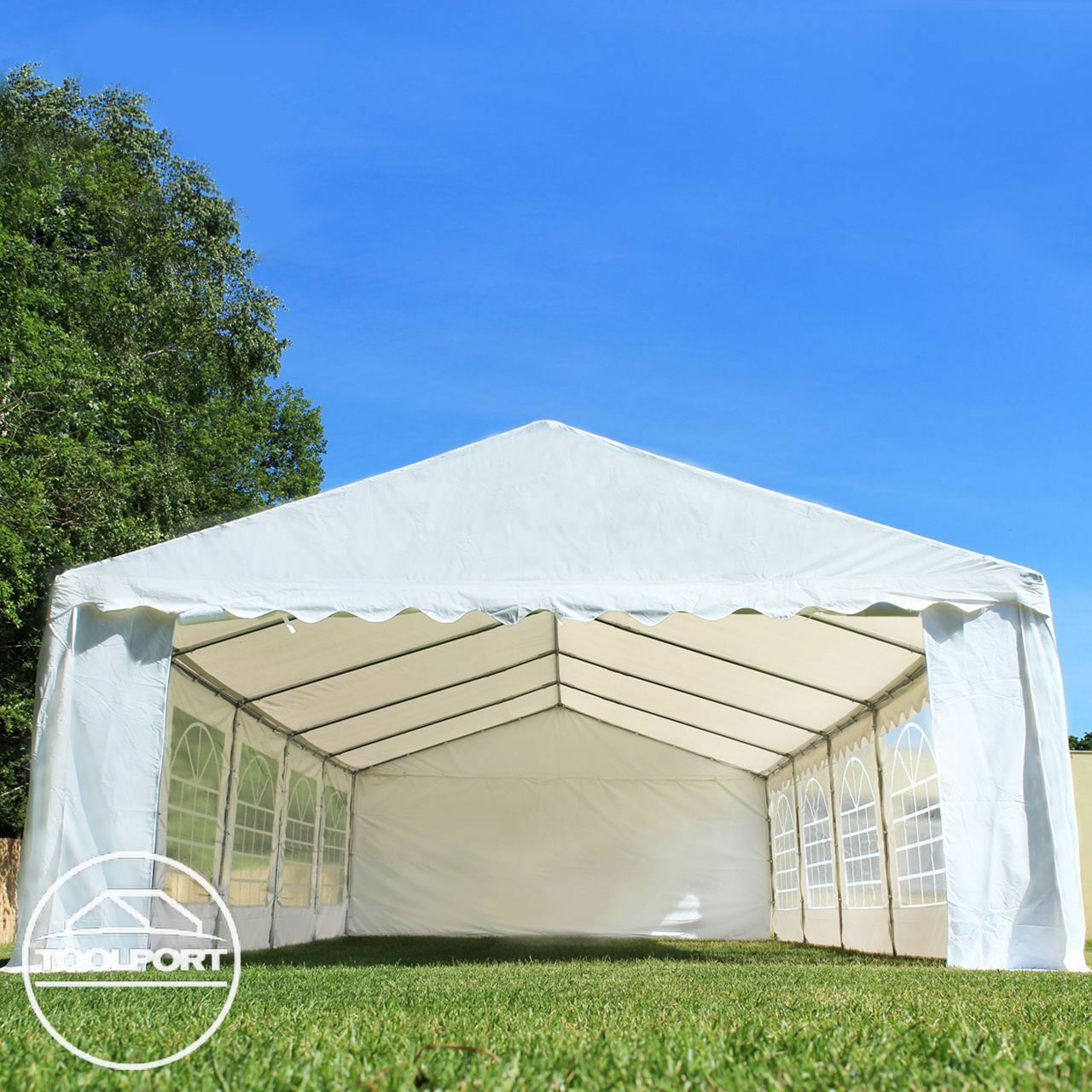Das Premium Partyzelt der Linie OPTILine vereint Robustheit und Portabilität. Das stabile Stahl-Gestänge wird durchgesteckt verschraubt und ist vollverzinkt und somit korrosionsgeschützt. Die Planen bestehen aus schwerem PE-Material 450 N, sind UV-beständig und zu 100% wasserdicht. Die Nähte innerhalb der Dachplane sind im Hochtemperaturverfahren verschweißt – Regenwasser bleibt draußen. Um das Zelt herum bestehen viele Möglichkeiten für Eingänge. Giebelwände oder einzelne Seitenteil-Elemente lassen sich nach Bedarf anbringen. Für dieses Partyzelt bieten wir eine 10-jährige Beschaffungsgarantie von Ersatzteilen ab Kaufdatum.