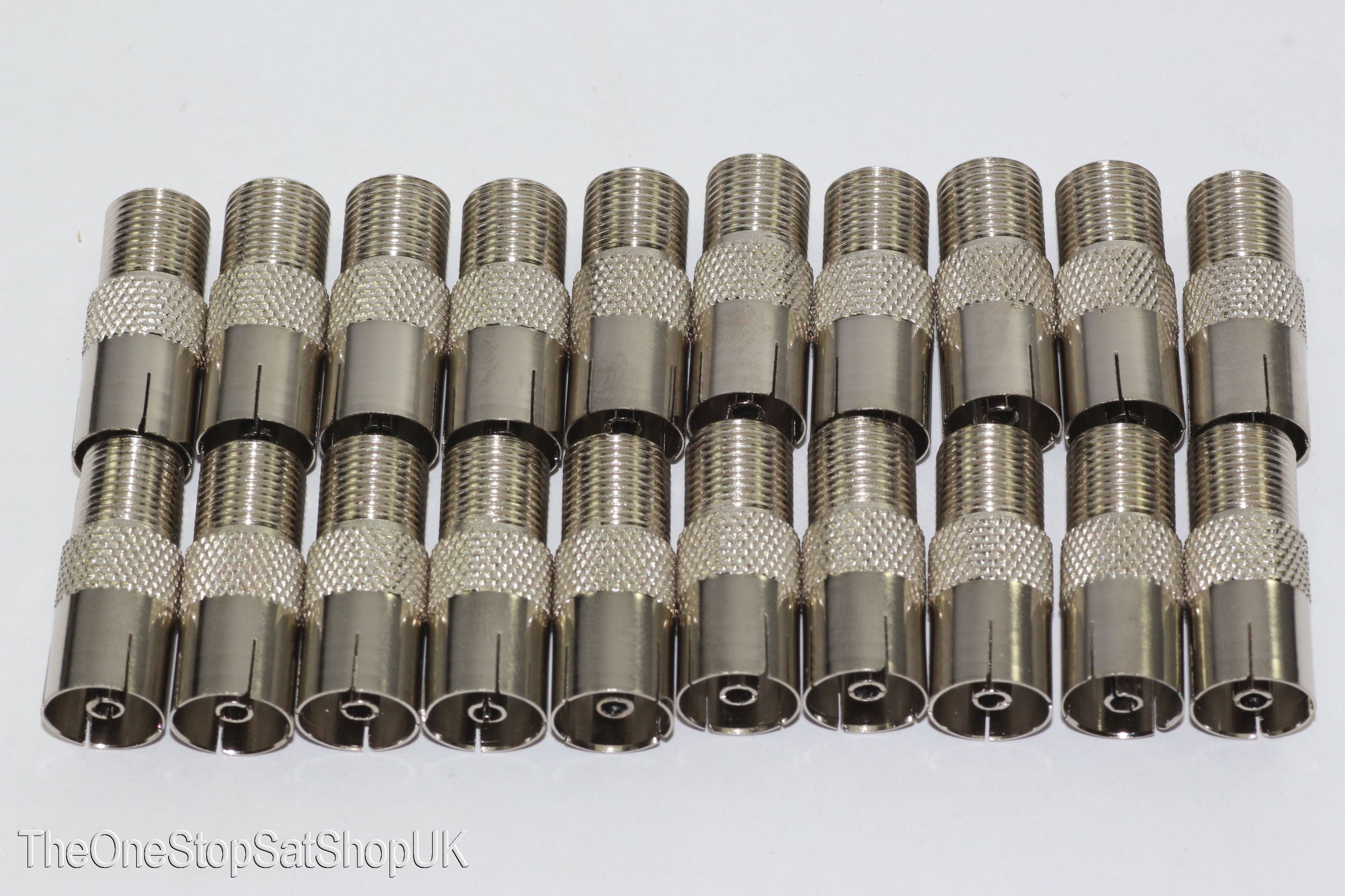 Excellent Value, 20 pack of F plug adaptors. Convert an F lead to one with a female coax connector on the end.