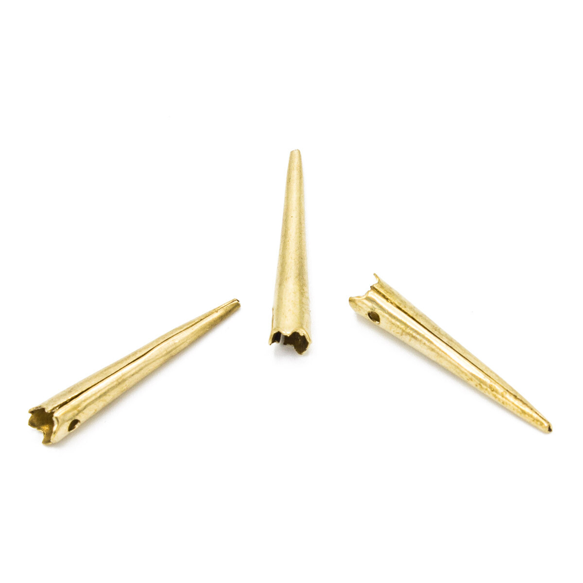 Replik einer einfachen Nestelspitze in Messing mit zwei Löchern zum annieten oder annähen.
