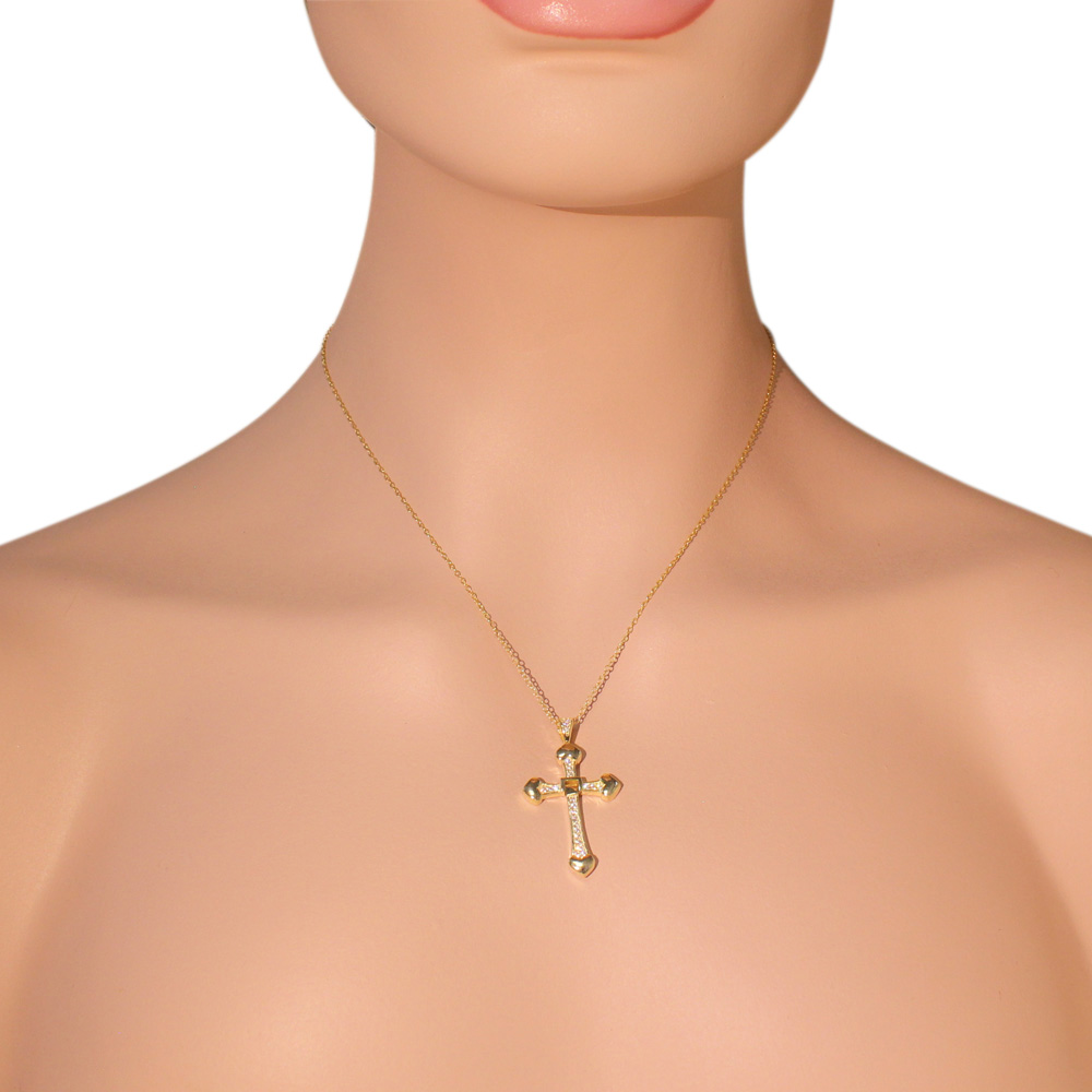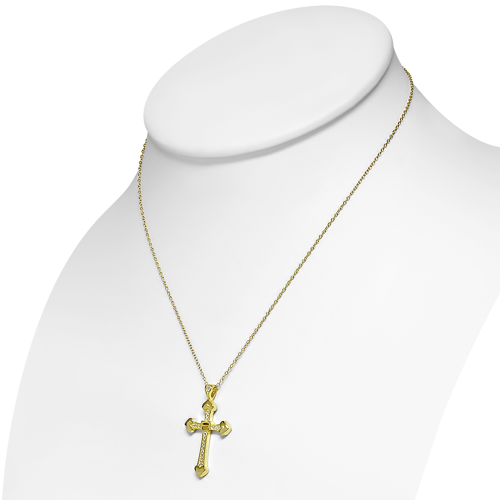 Feature 1: | CROSS DESIGN, yellow gold tone religious cross pendant necklace with heart charms on end of cross and sparkle white clear stone accents |