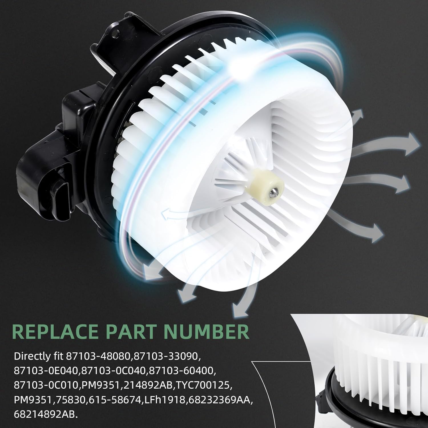 speedyevil01 replacement blower motor is made of high quality material which is reliability, and durability. It can be easily installed with no special tools required and just Simply remove the old blower motor by removing a few screws under the passenger side dash of your vehicle, then install the new one in.