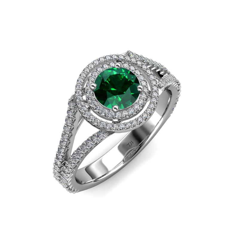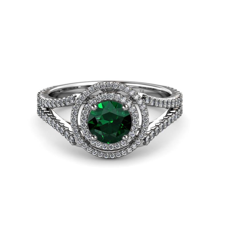 Round Emerald Diamond Double Women Halo Engagement Ring 14K White Gold.