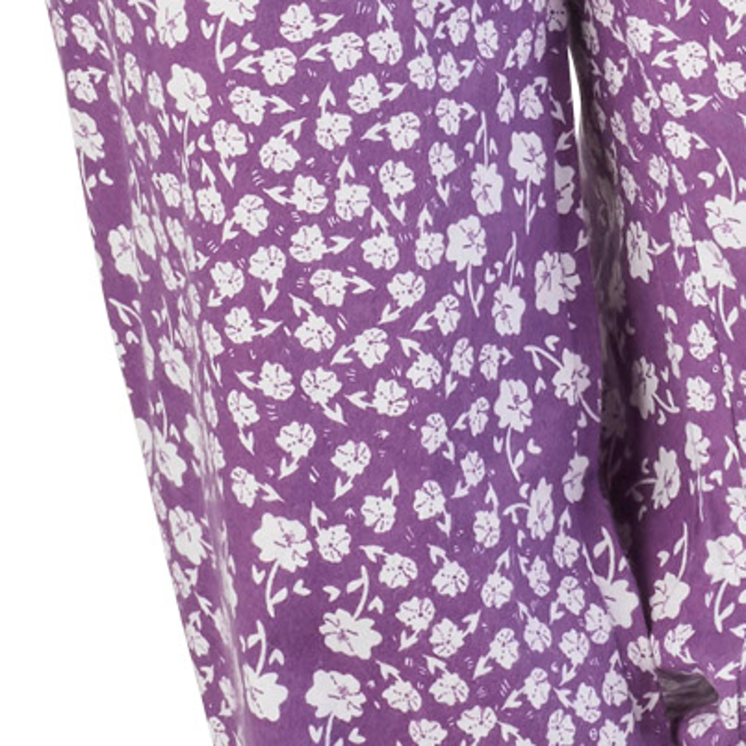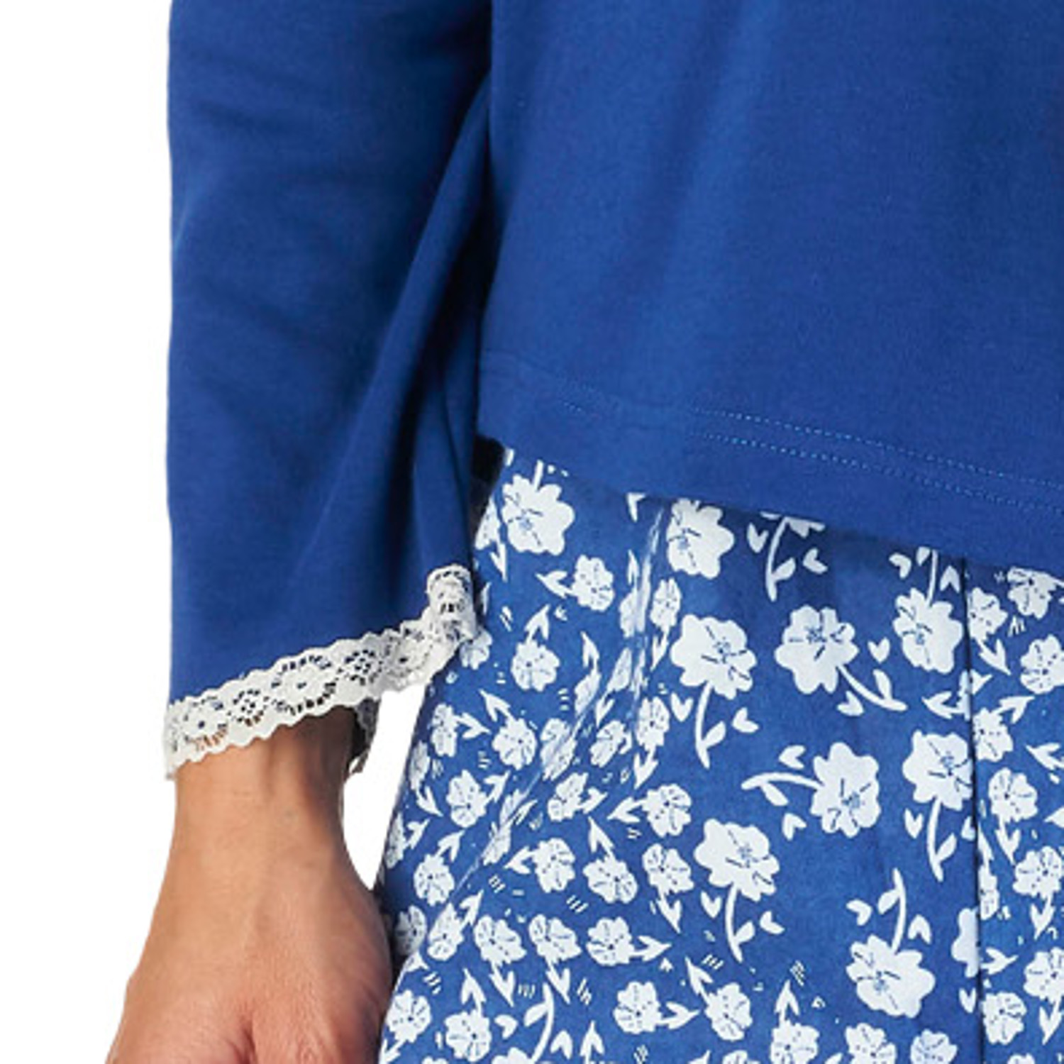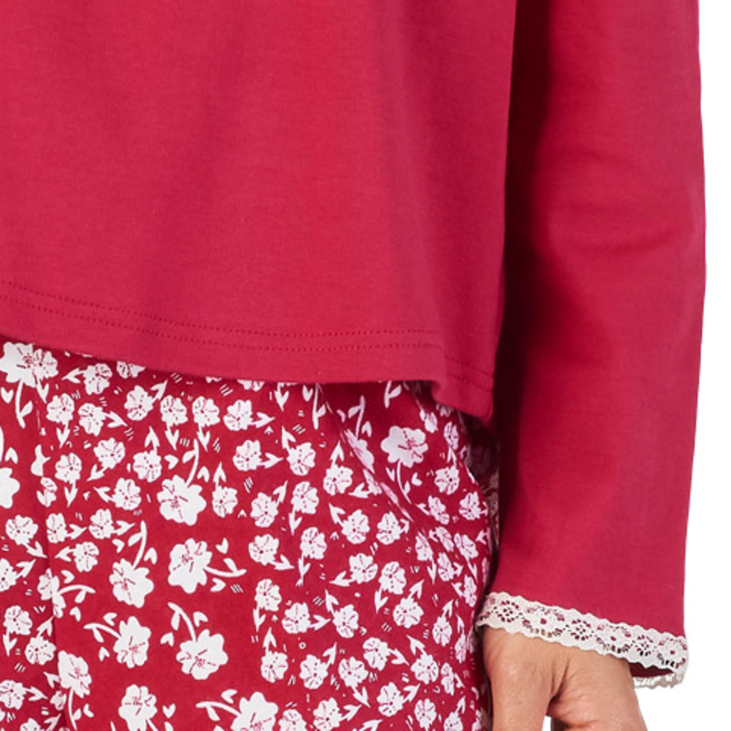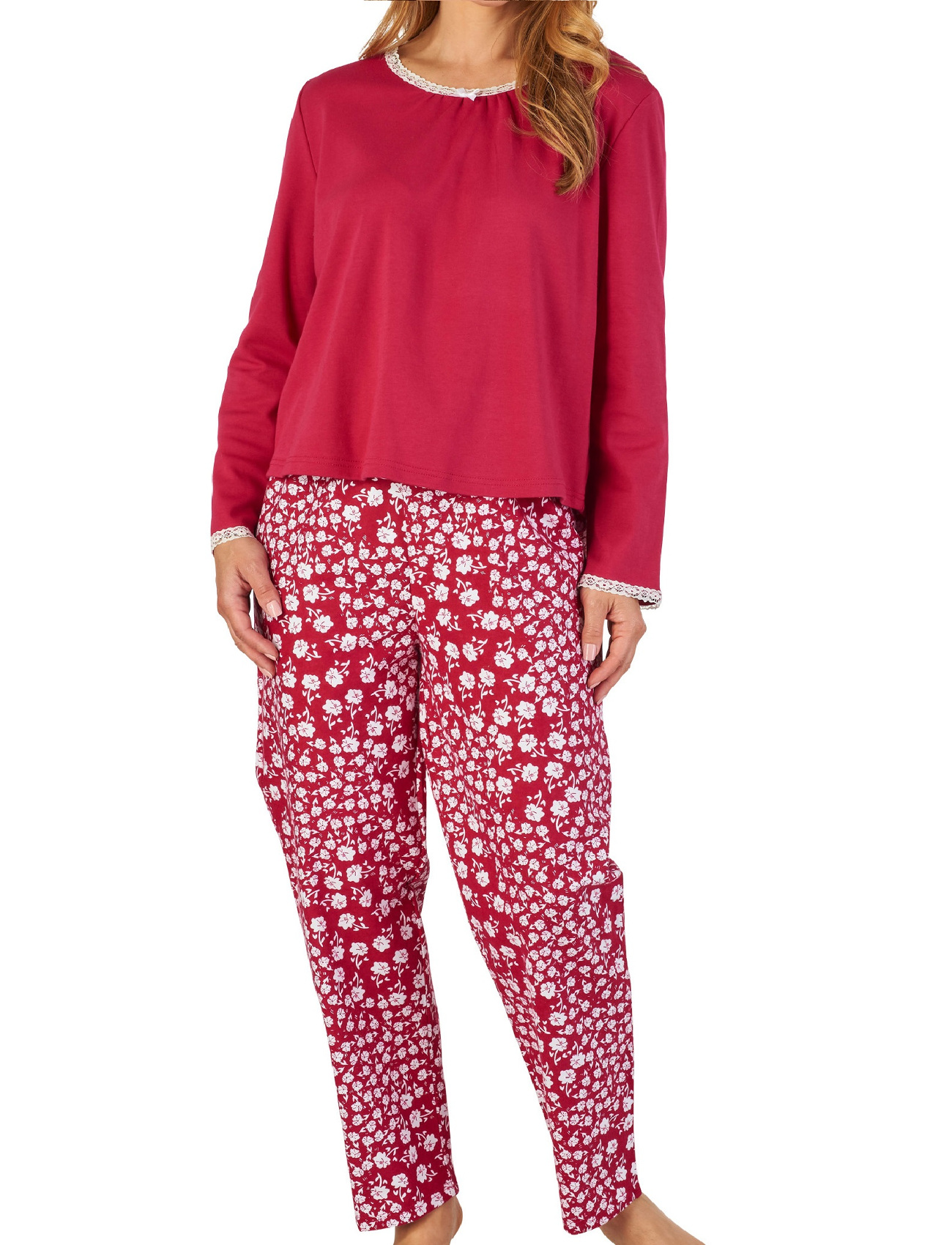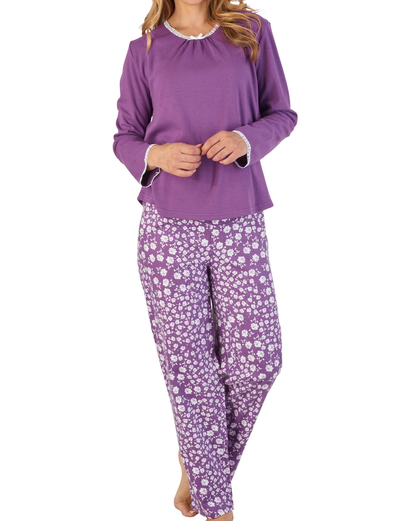 These ladies pyjamas sets by Slenderella include a long sleeved plain jersey top with lace trim and a pair of full length printed floral brushed cotton PJ bottoms with an elasticated waist.