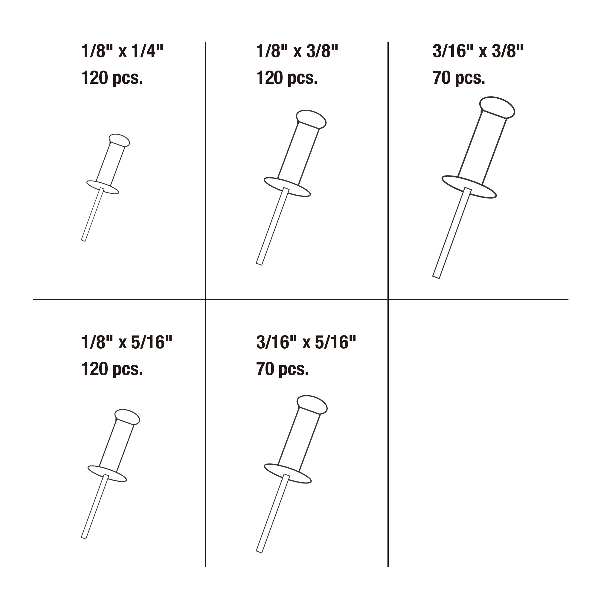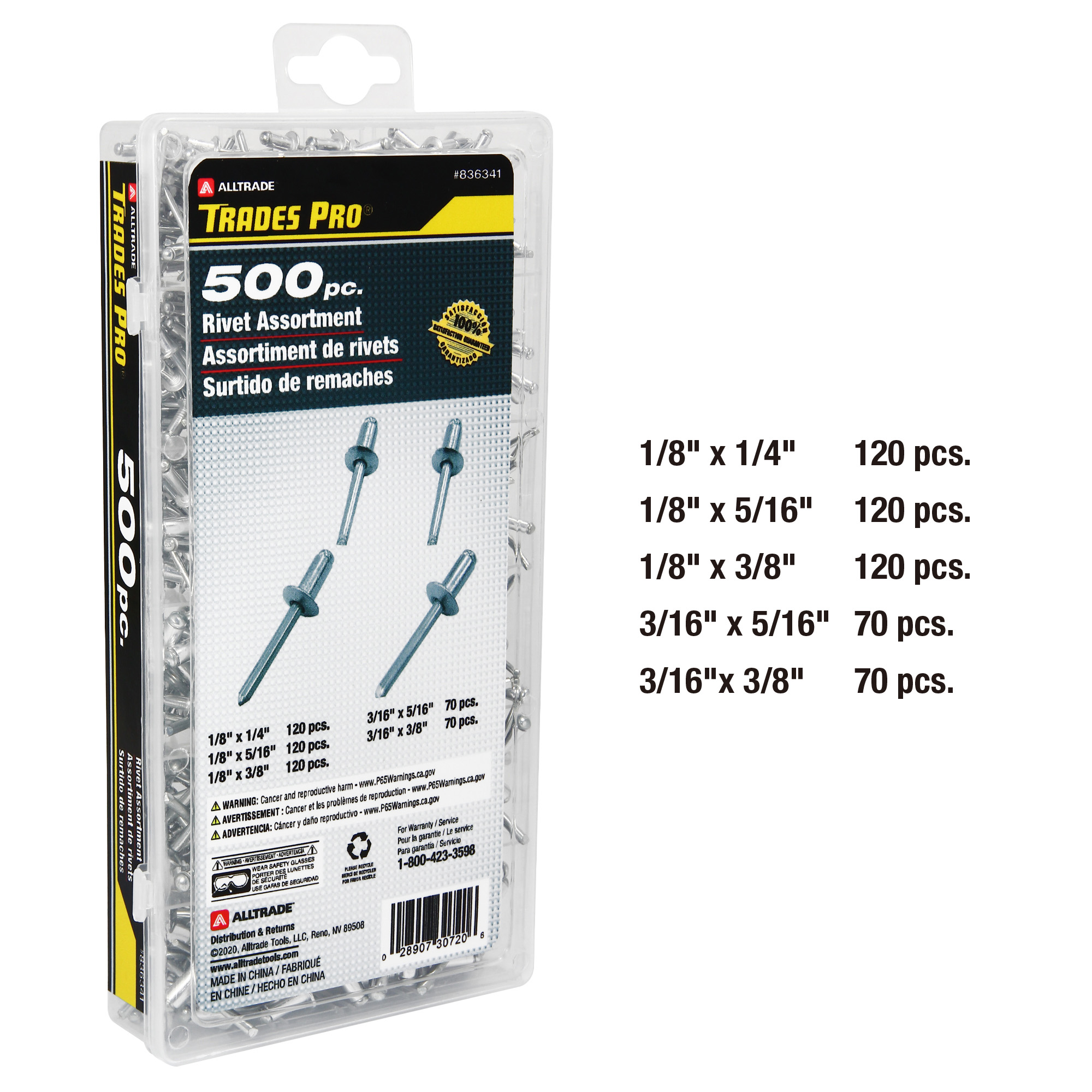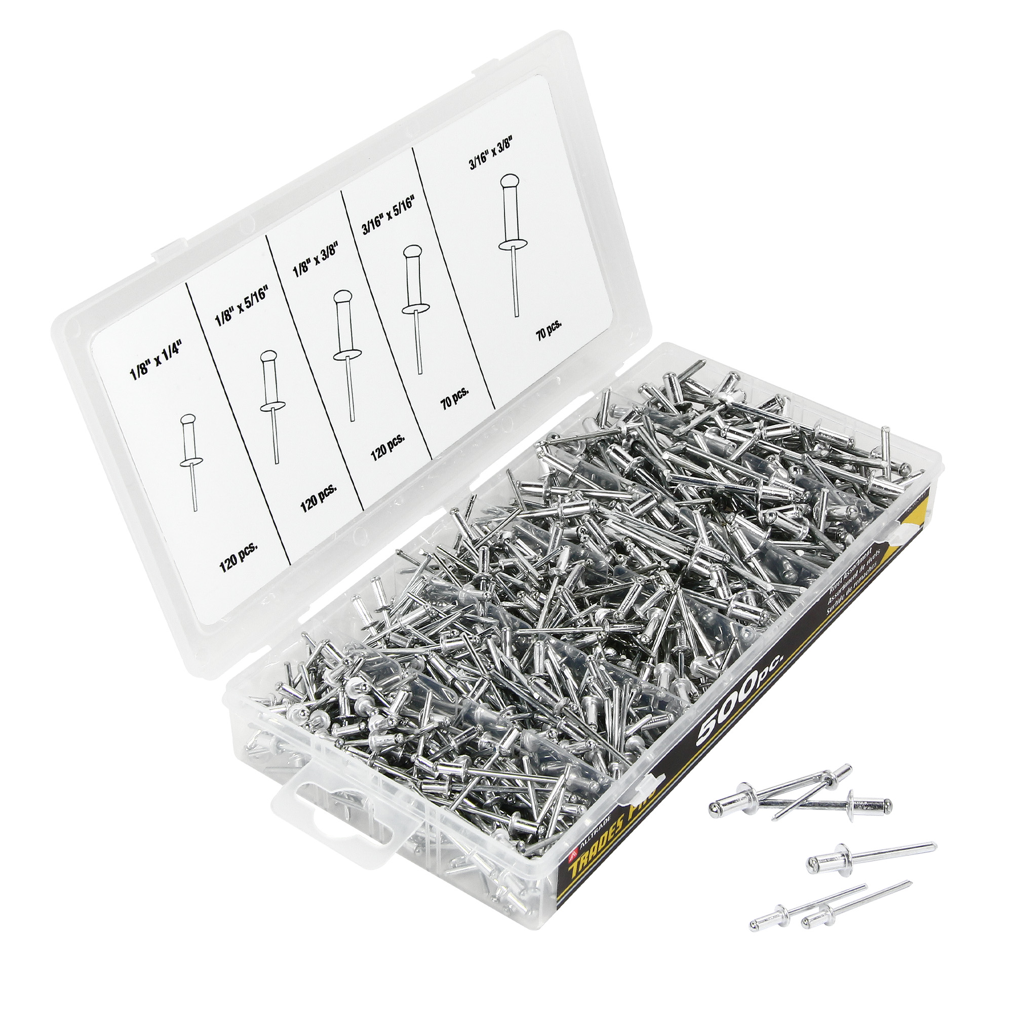 Every toolbox, workshop, garage, and truck box needs this incredibly handy 500 Piece Rivet Assortment. With a wide range of pop rivet sizes and styles, chances are the size you need will be here and if not, at least there will be something to improvise with. The durable storage case has interior dividers and a printed size guide for easy identification and selection.