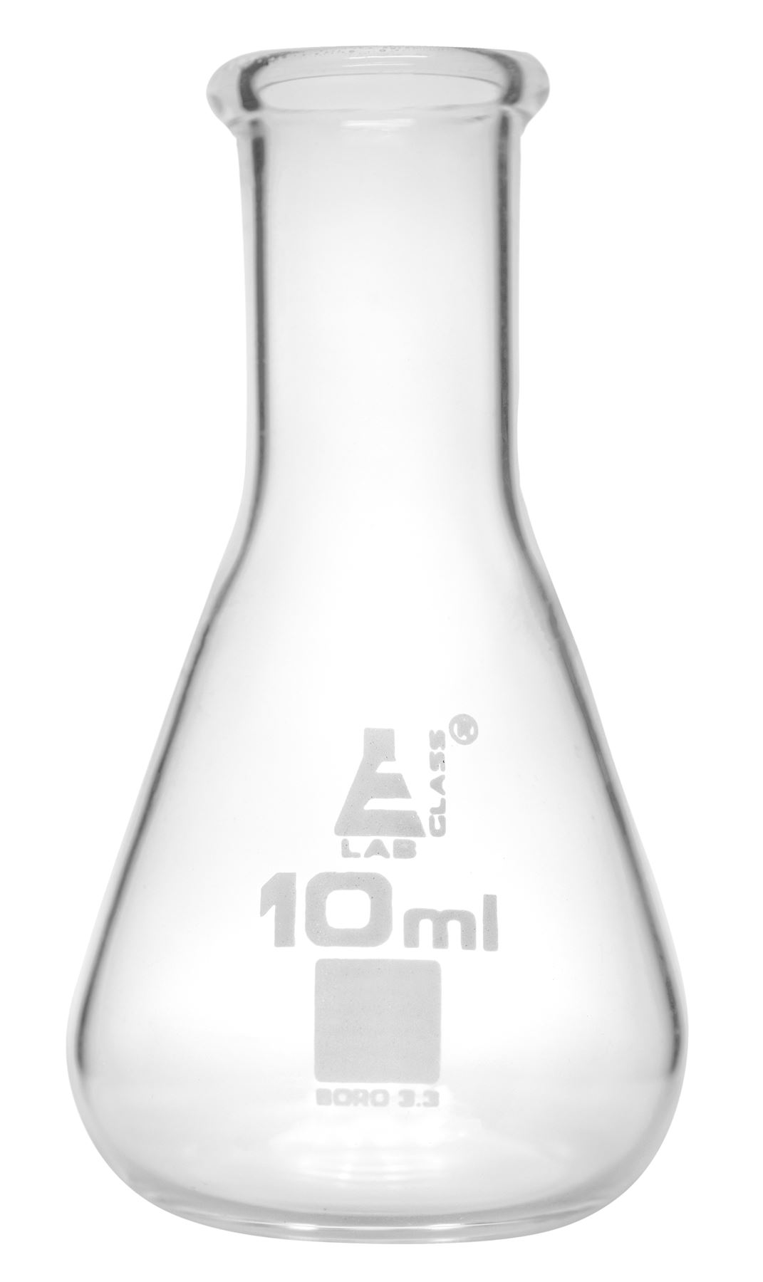 10ml capacity, narrow neck conical flask. Made of high quality borosilicate glass. Flask stands 2.25" tall and has a base measuring 1.25" in diameter. Neck measures 0.85" in length and has a diameter of 0.6". Inner diameter of neck is 14mm, outer diameter is 17mm.
