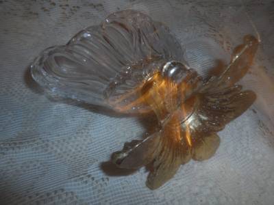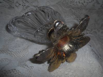 This is Such a Pretty Crystal Elegant Pressed Glass Cast Gilt Leaf Metal Pedestal Vanity Trinket Compote Soap Dish!Very Heavy,with an Oval Dish and Scalloped Rim,it is in Great Vintage Condition,with No chip's or crack's and measure's 41/4"tall x 6"long across top x 33/4"wide across top x 5"wide across bottom.If you like Vintage Item's,please have a look at my Store,'NeisesAttic.com,'and save on shipping when you buy more than one item!I hope you will add me to your list of friend's,as I will be adding new Vintage item's weekly!Have a look at my Blog while your there!15I ALL MY ITEM'S ARE ANTIQUE OR VINTAGE,SO SOME WEAR IS EXPECTED IN CERTAIN ITEM'S!I LOOK ALL MY ITEM'S OVER CAREFULLY FOR ANY DAMAGE BEFORE LISTING AND PUT ANY FOUND INTO MY ADD'S,BUT I AM NOT PERFECT,SO PLEASE LOOK AT ALL PHOTO'S IN MY ADD,AS THEY ARE PART OF THE DESCRIPTION ALSO!!!