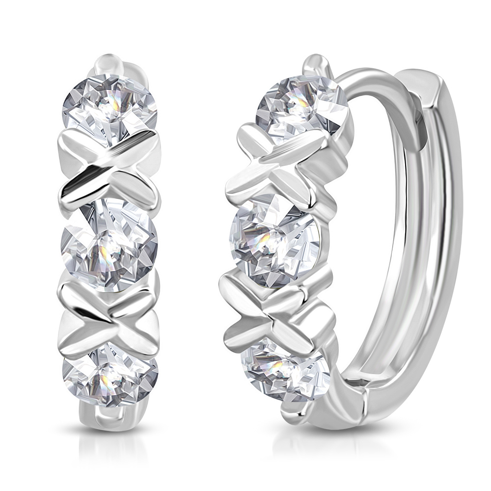 Feature 2: | Elevated design: An chic pair of huggie hoop earrings with glistening CZ stones set between raised Xs. It closes with a hinge snap-post closure. |