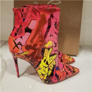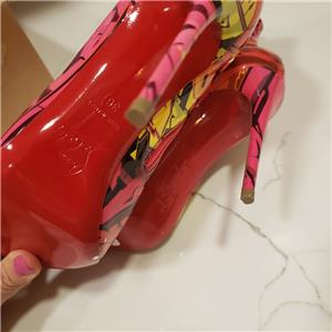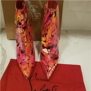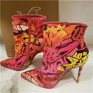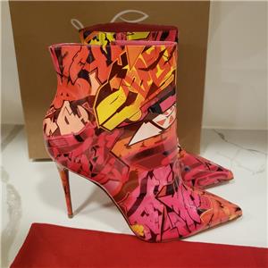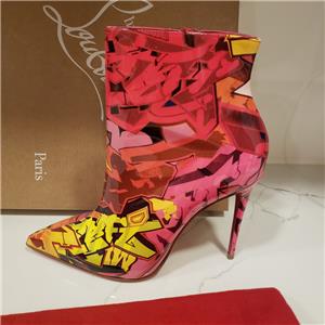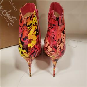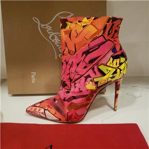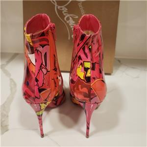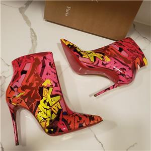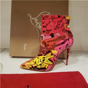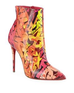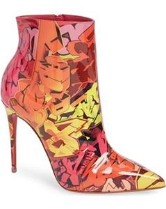 - Stylized graffiti brings downtown cred to an uptown bootie styled to be seen with a perfectly vertical stiletto and a dramatically pointed toe. Christian Louboutin's iconic red sole-born from a fateful brush with red nail lacquer-splashes brightly under each step.