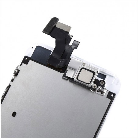 Un écran pré-assemblé comporte la caméra avant, le haut-parleur interne et la plaque métallique.