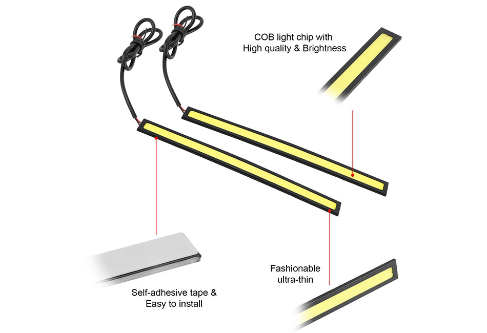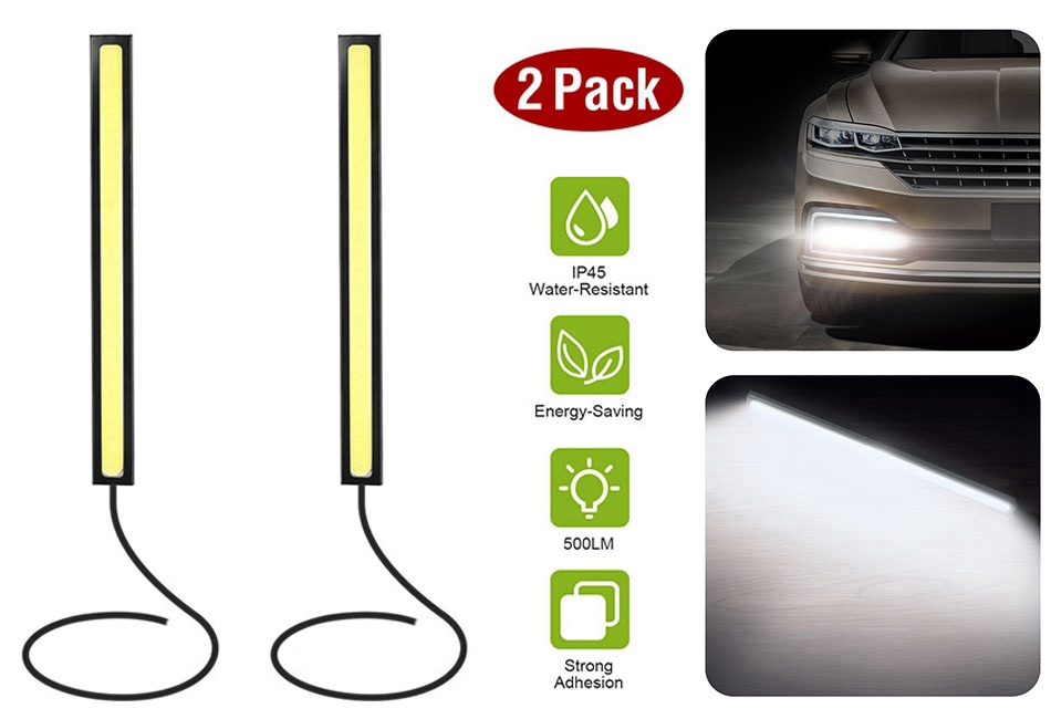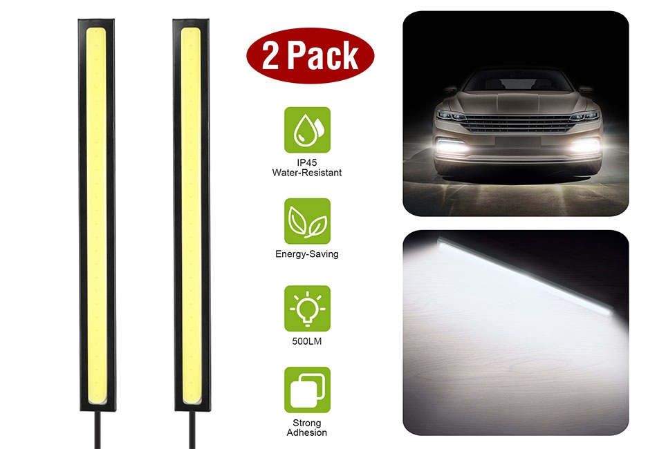 Our day running light is an excellent car accessory with its super slim design. It can be used as a daytime running light to improve the identification of your vehicles, prevent accidents in advance, and ensure driving safety. Besides, it can be used as backup light, fog light, chassis light and more. Its bright white light helps to light up dark trails, truck, or car while you are for wheeling. Moreover, it is easy to use, since the day running light is designed with 3M double sided foam tape, which makes it more sticky and durable. Just stick it your car and connect it directly to 12V power source, it will light up when your starts. Also because of the low amperage draw you can easily wire them into your existing lighting without any issues of blowing fuses.