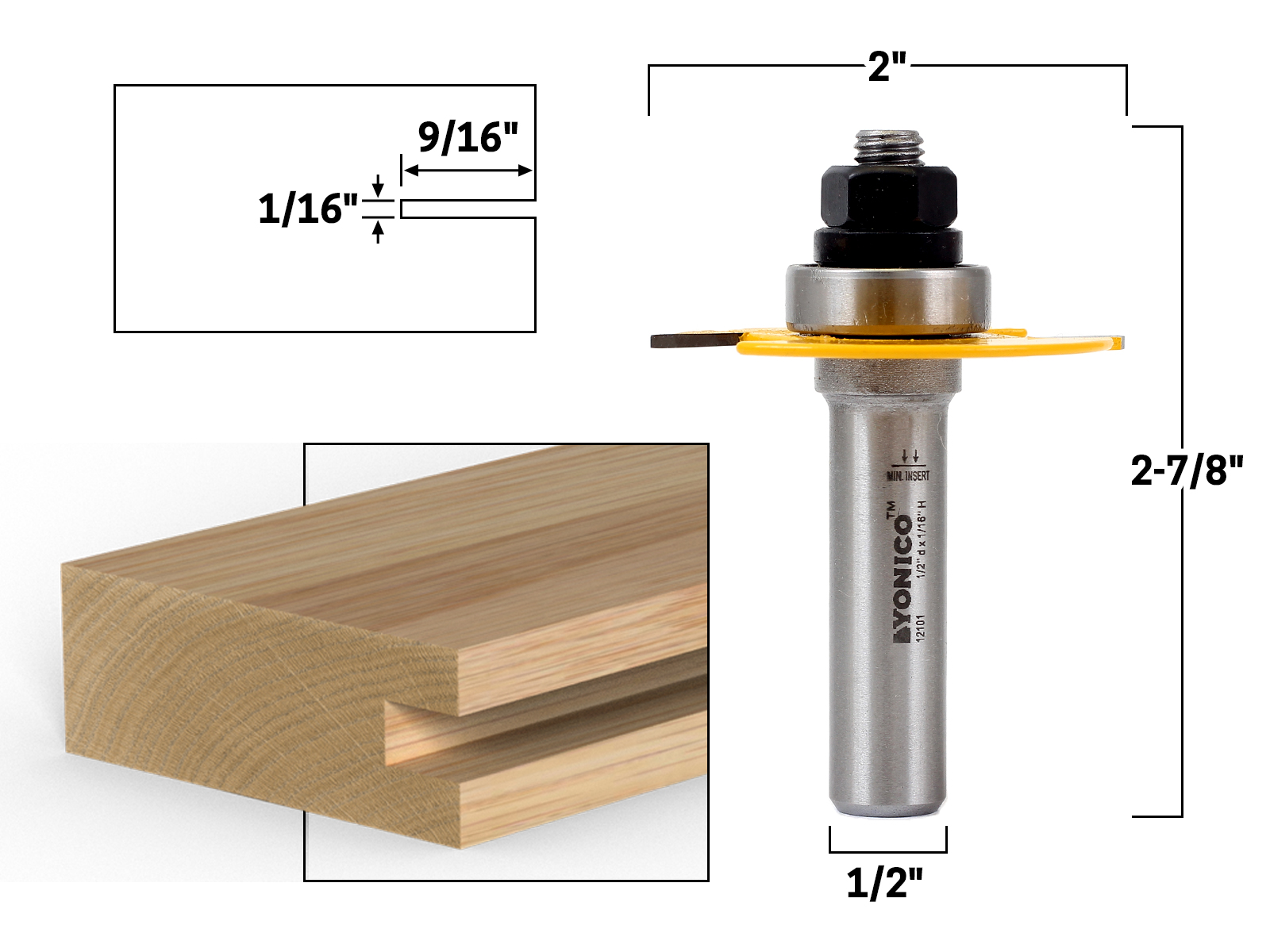This slotting cutter router bit assembly cuts 1/16" thick x 1/2" deep slots. Comes complete with 1/2" shank/arbor and bearing, washers and nut.