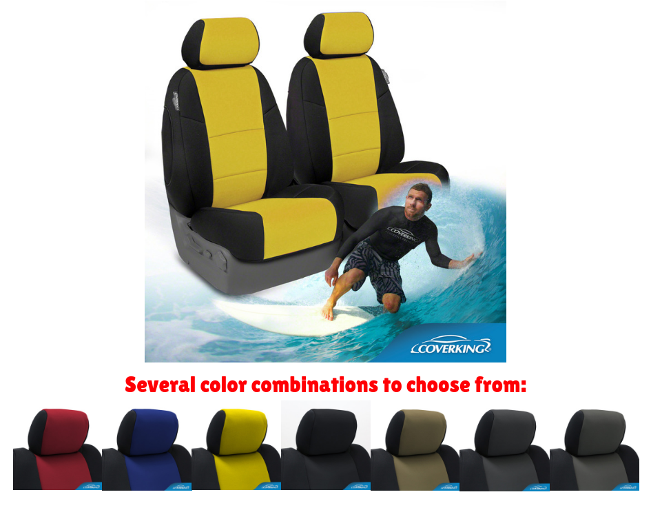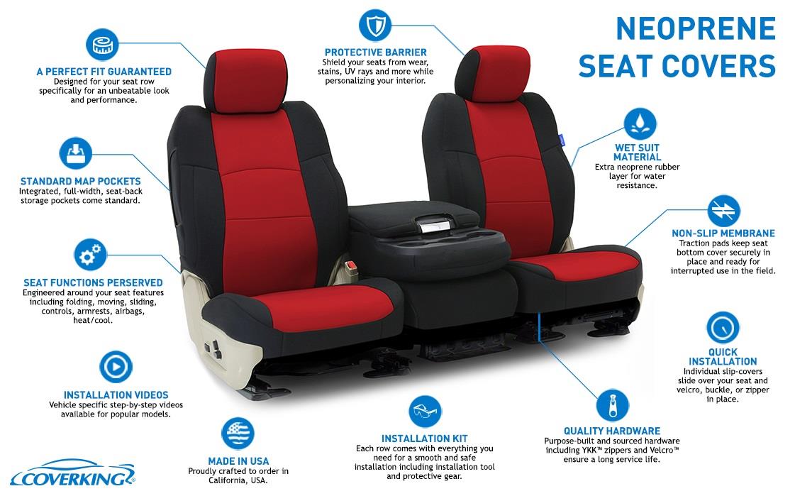 Our CR-Grade Neoprene Custom Seat Covers are made from the same quality material used in high-end wetsuits. These covers are extremely water resistant and very durable. Each cover also has a soft and cushioned feel while displaying a sporty design. Neoprene covers are the best fitting seat covers you can find in the market. These covers can be installed in less than 30 minutes and are made to custom-fit your vehicle to include air bag cutouts (where applicable) and even map pockets . You won’t find a more stylish or more durable product than our Neoprene seat covers.