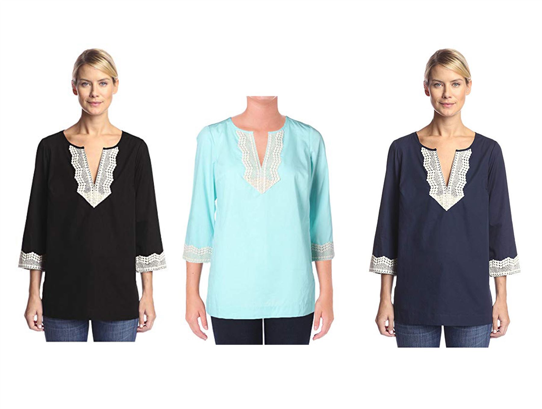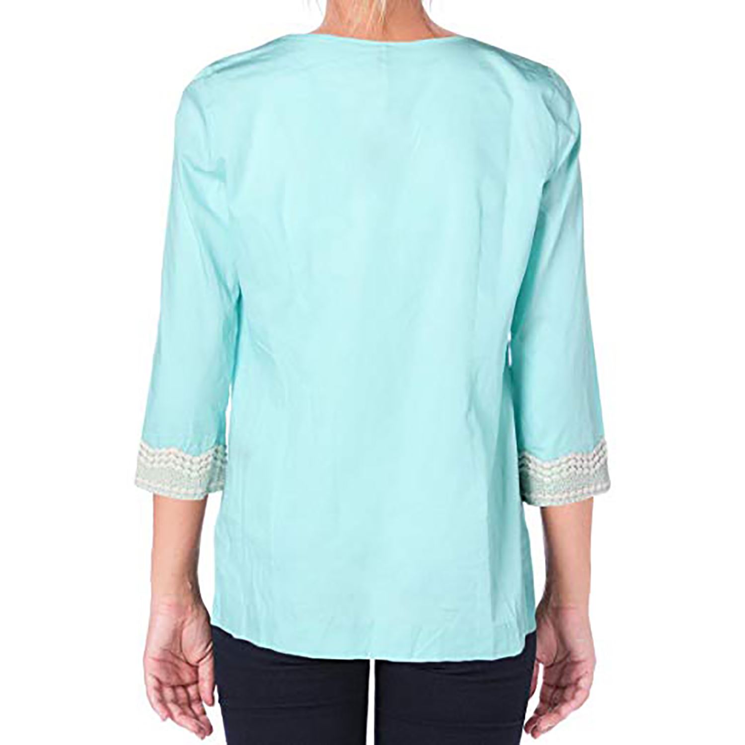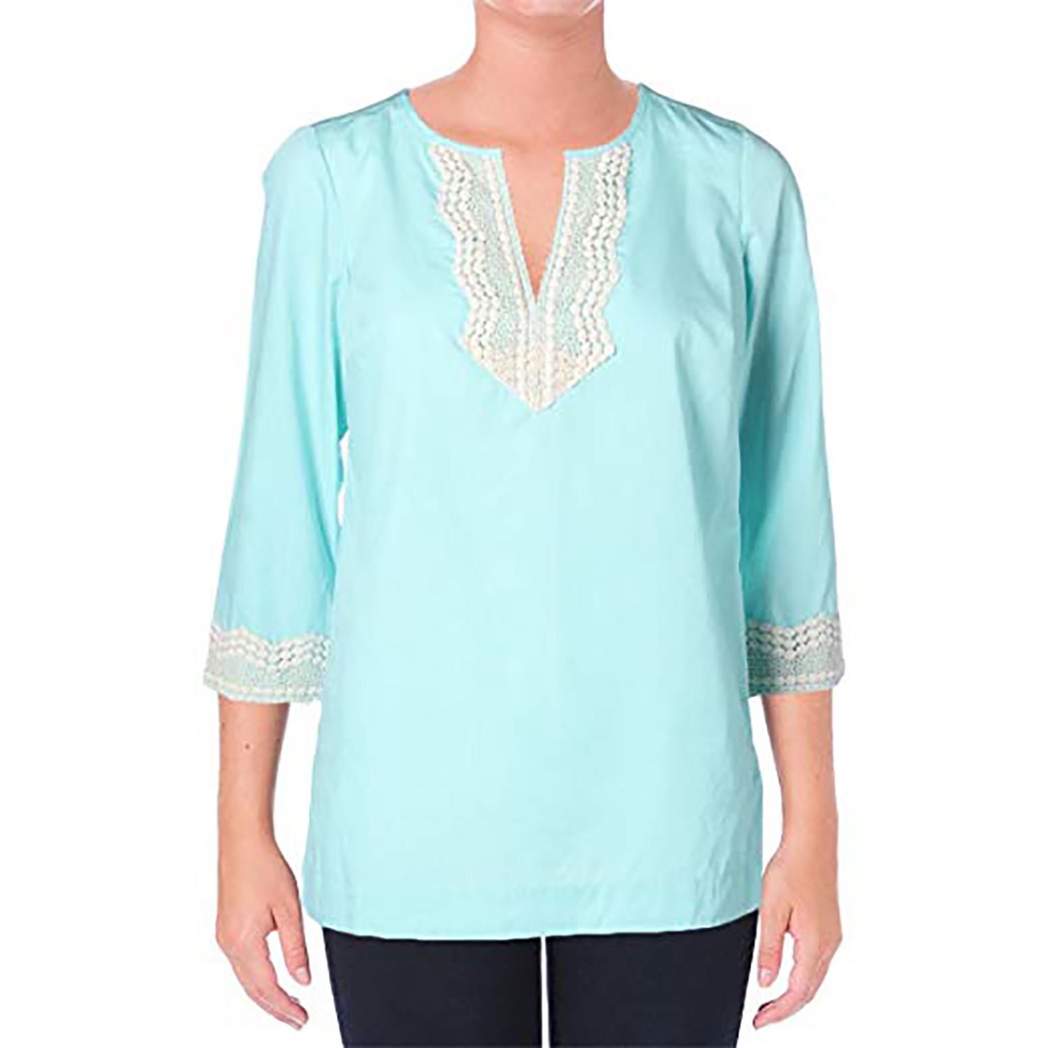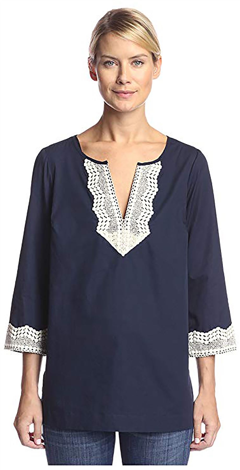 Pull-on construction. Split neckline and embellished lace details.