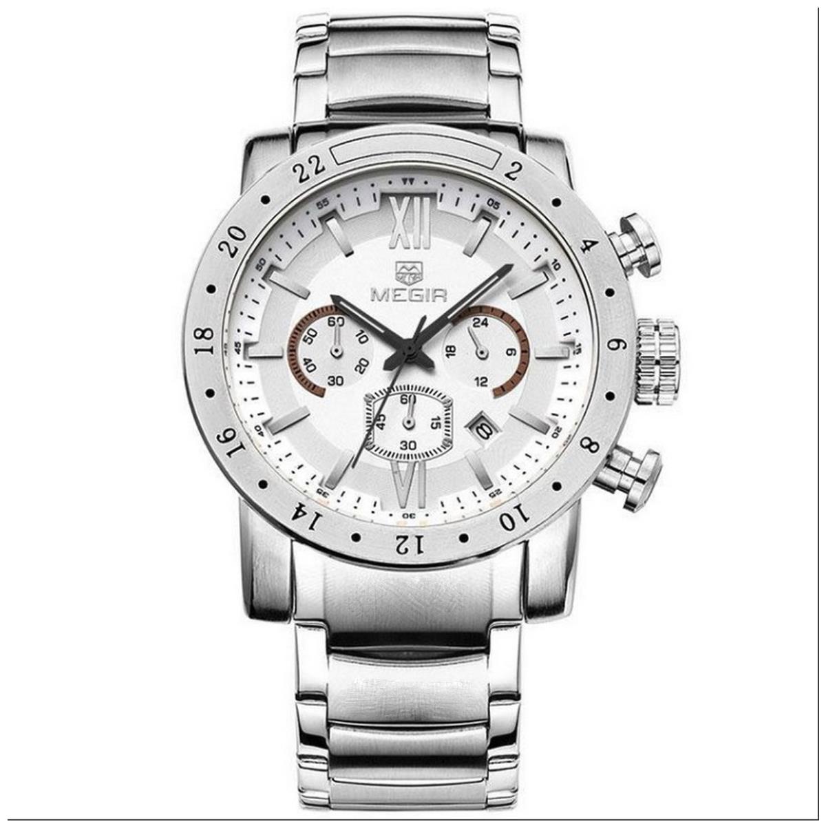 Stunning homage quartz battery watch we have direct from the branded Megir manufacturer. Megir have been making high quality watches for several years and this watch comes with a classy white face that has luminous hands, silver hour markers, 24 hour time, chronograph and date dials. The watch comes with a comfortable silver stainless steel strap and the bezel is not rotating. Watch has been tested for water resistance up to 30m and has strong durable mineral glass for protection against scratches. The watch can be purchased either in a frustration free packaging or with the gift box and paperwork although this has a extra charge due to the size and weight. The watch is genuine value for money as the quality and look are befitting a much higher price. You will not be disappointed with the excellent calibre of this watch